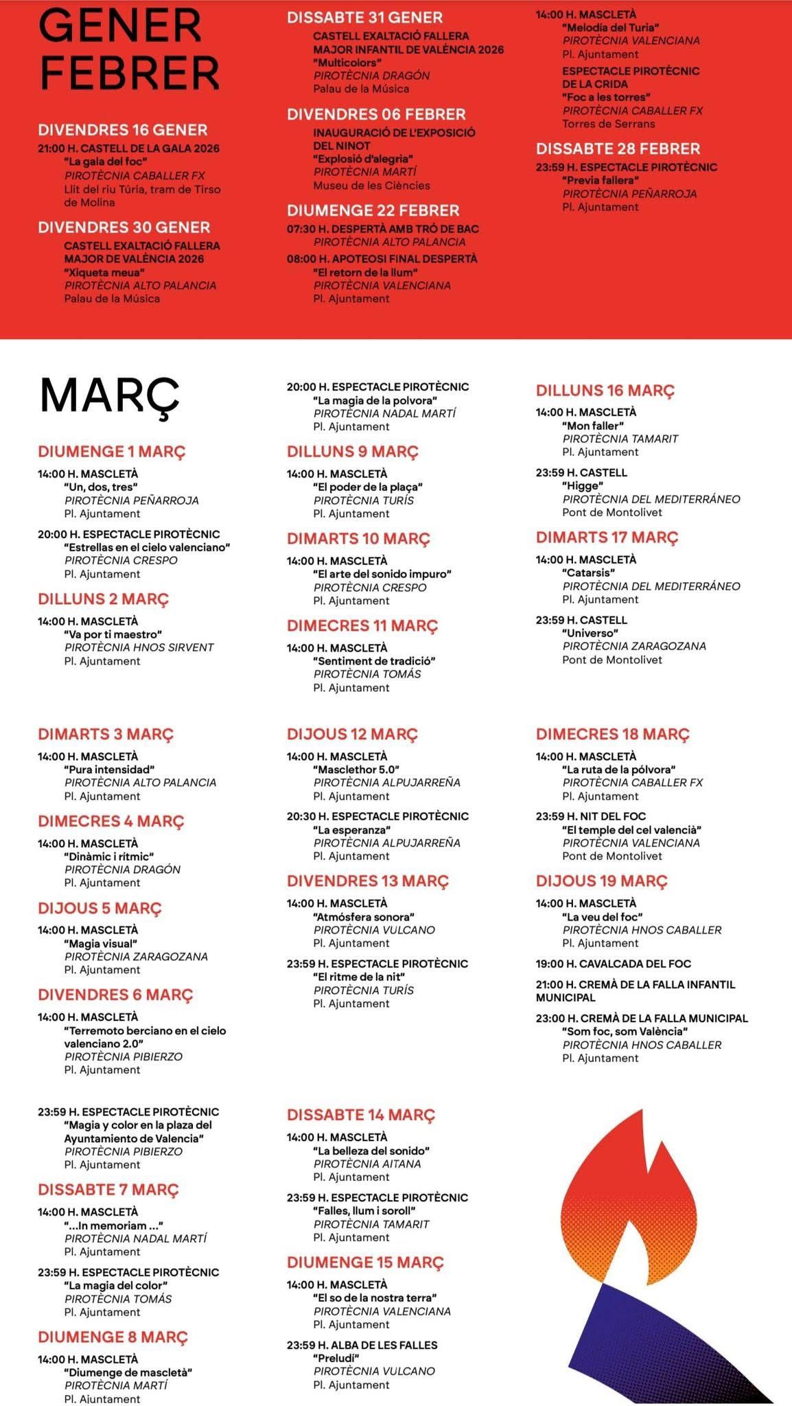 Calendario completo de espectáculos pirotécnicos – Fallas 2026