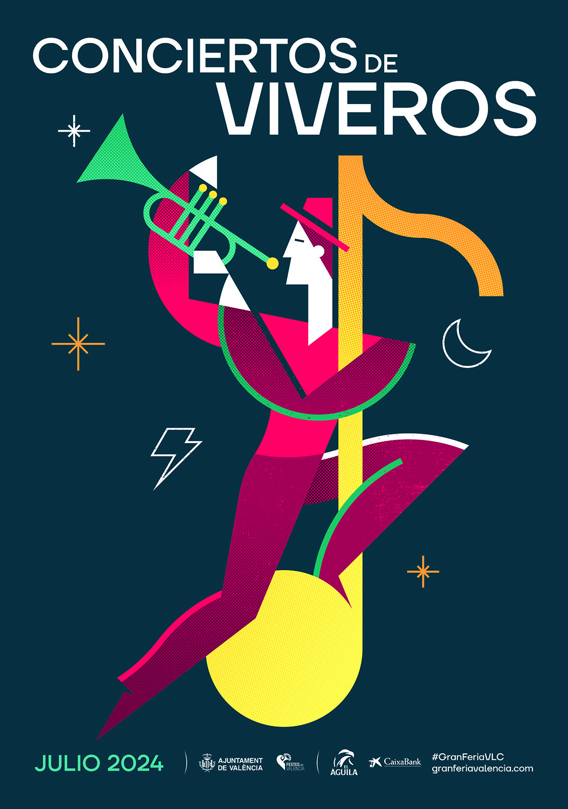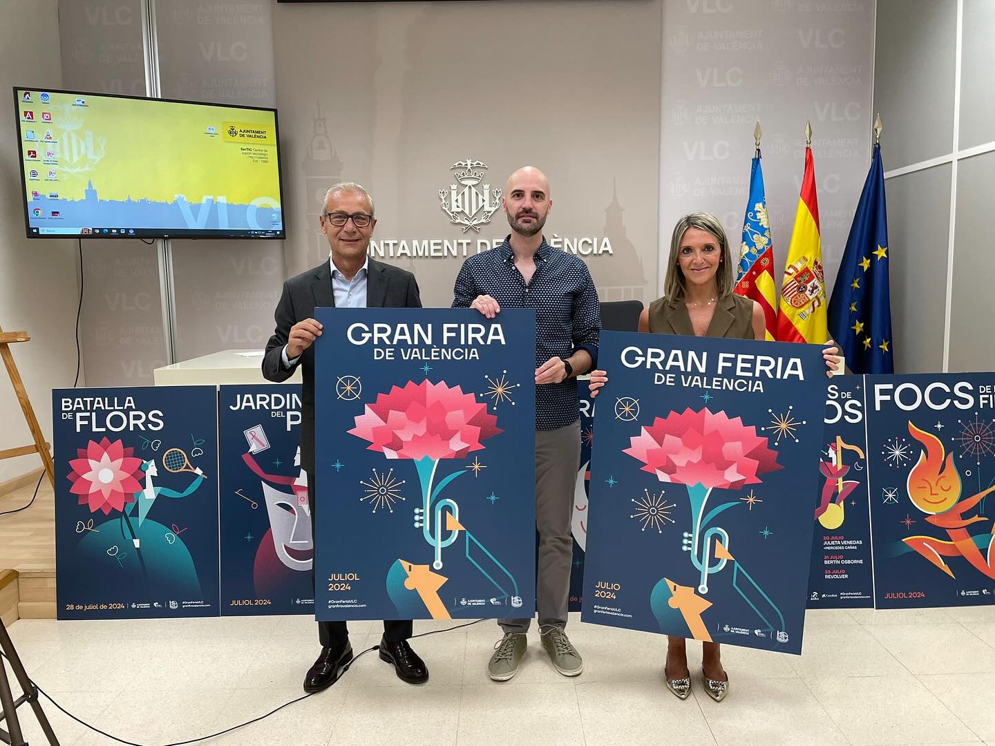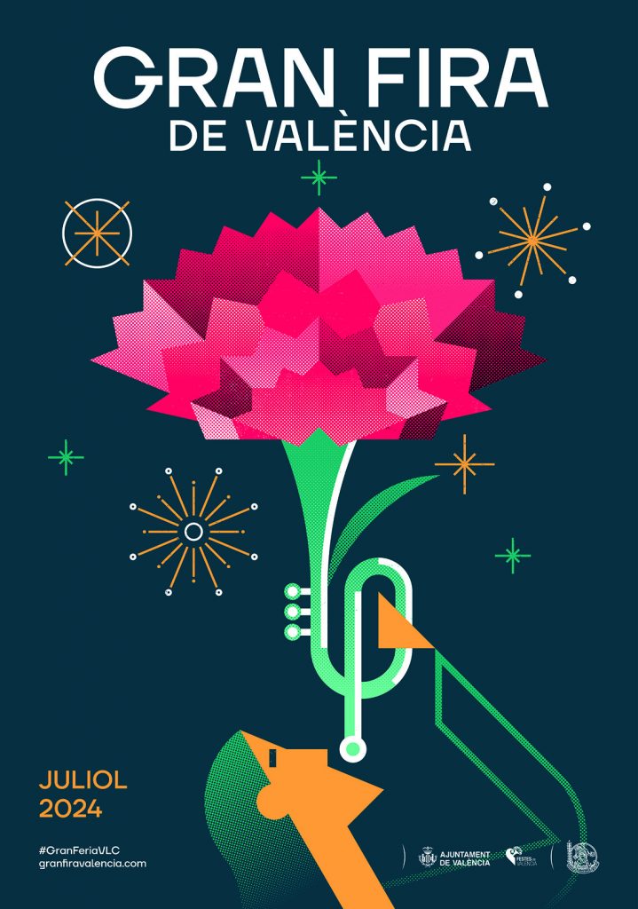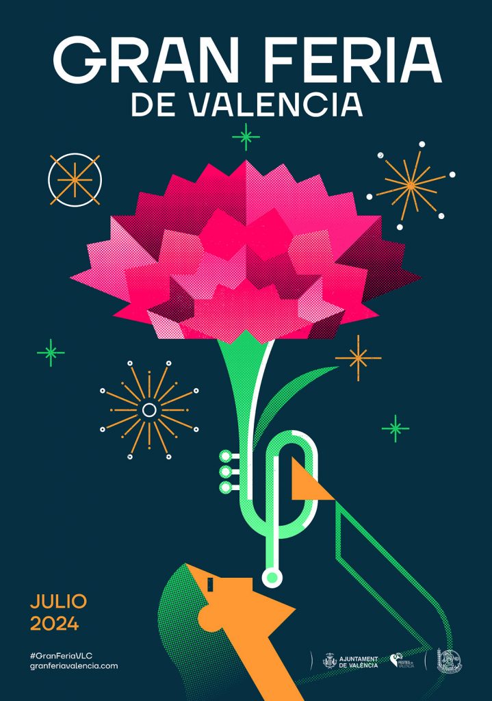 El cartel principal recoge una síntesis de los momentos y emociones que trasmiten la llegada de la fiesta: un clavel de la Batalla de Flors; una trompeta, que representa la música y a los tradicionales Conciertos de Viveros; así como los fuegos artificiales, que salen a la calle empujados por el bufido de la persona que toca la trompeta, lo que transmite que “la participación de los valencianos es el motor de la Gran Feria de València”, ha subrayado Ramón.