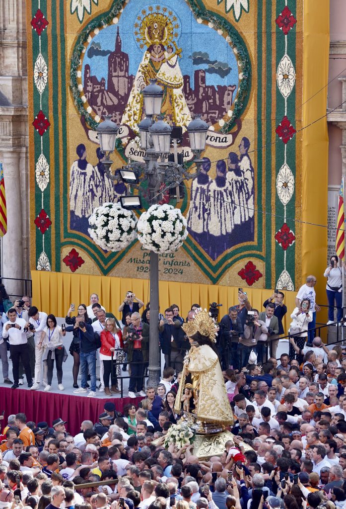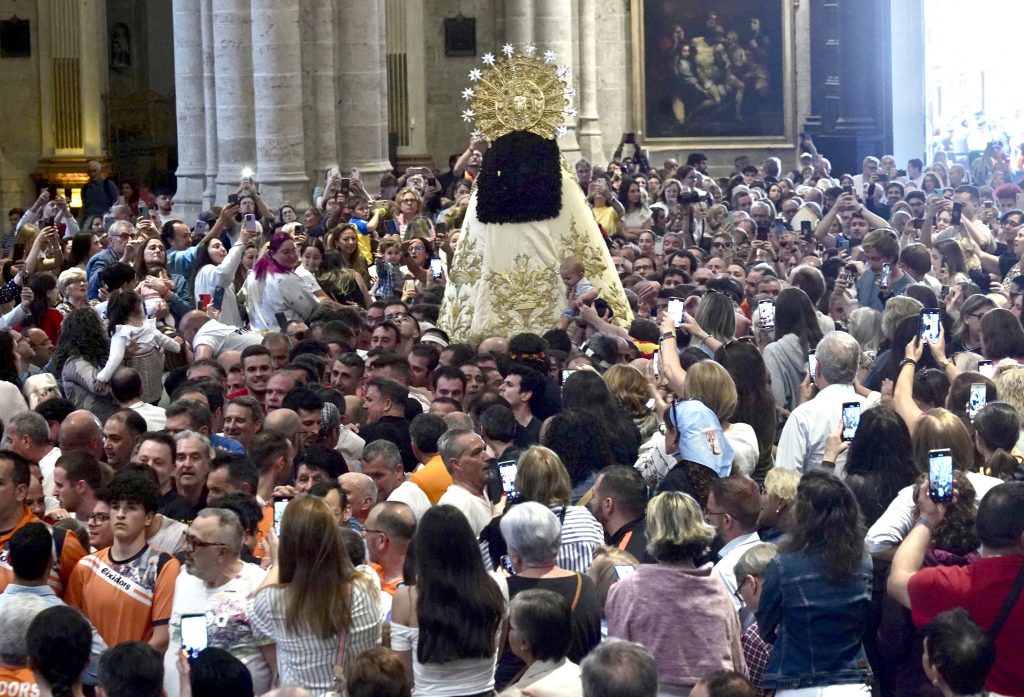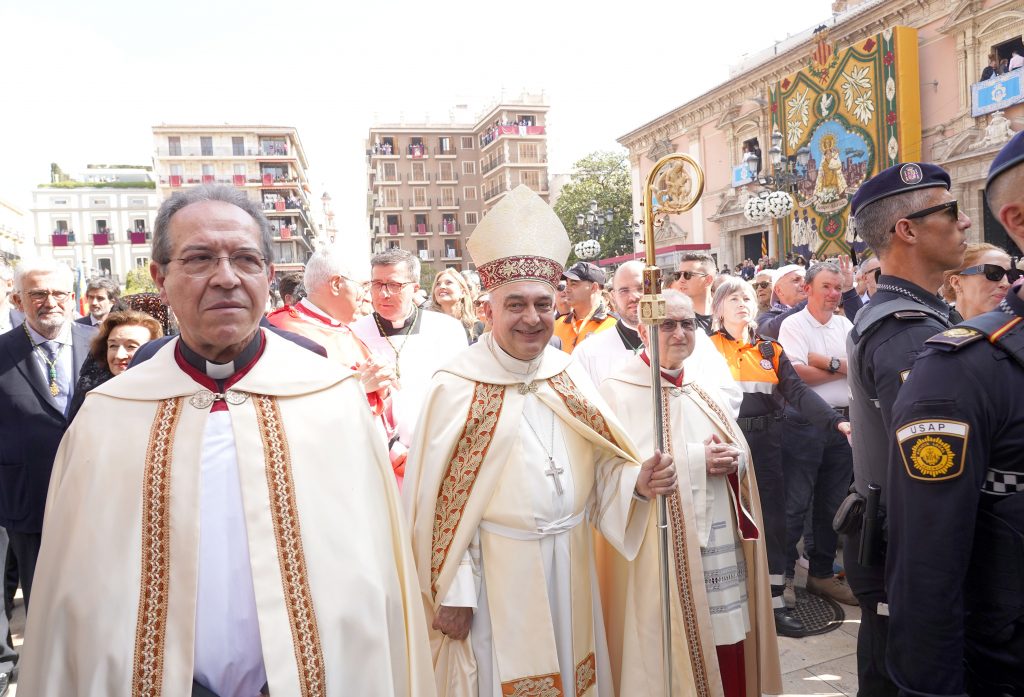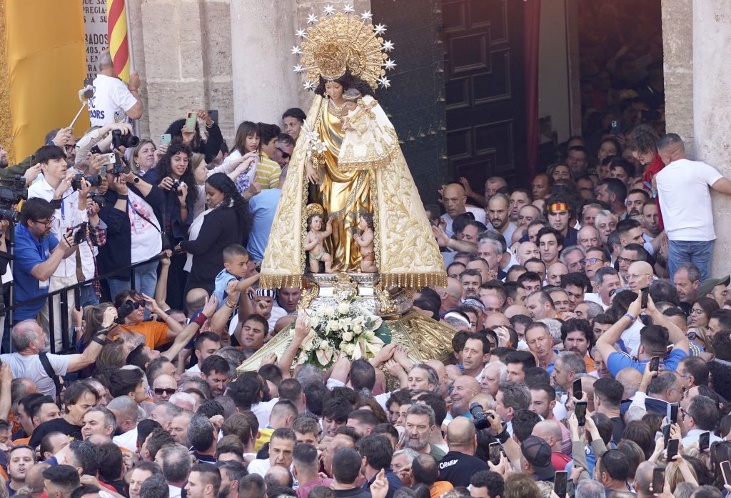 Después de la missa “d’Infants” la imagen ha salido de su Basílica y ha sido trasladada hasta la Catedral de Valencia por donde ha entrado por la puerta de los Hierros de la Seo donde se ha celebrado a las doce del mediodía la misa de Pontifical presidida por el Arzobispo de Valencia.