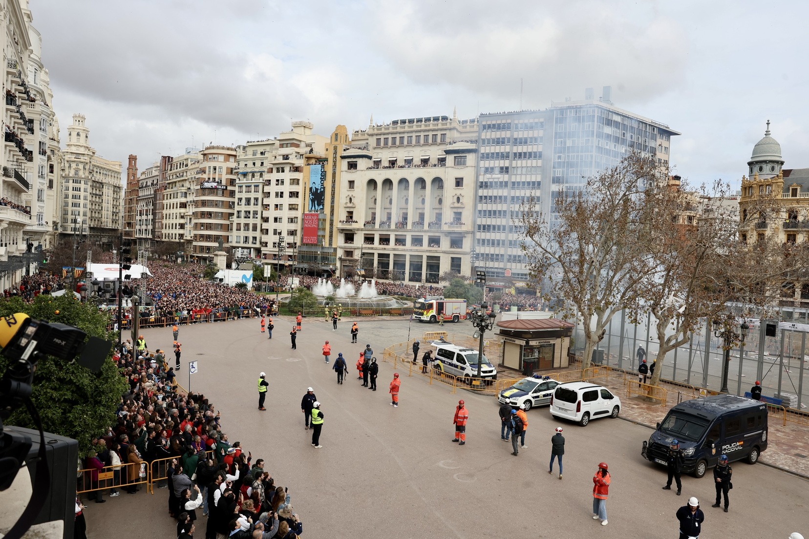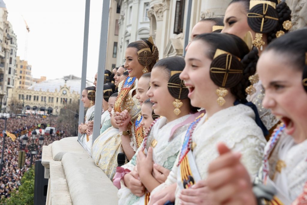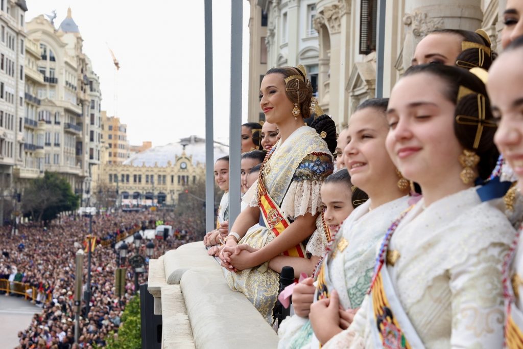 En el Balcón del Ayuntamiento, las Falleras Mayores de Valencia, Berta Peiró y Lucía García, han disfrutado de esta impresionante mascletà junto a sus Cortes de Honor y, como no, de la alcaldesa de la ciudad, María José Catalá, y Santi Ballester, concejal de Fallas y presidente de Junta Central Fallera.