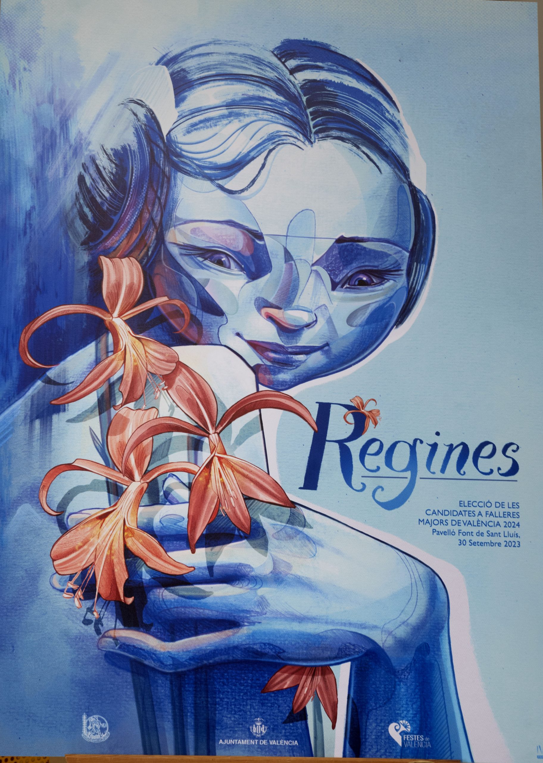 El ilustrador y artista fallero Iván Tortajada Estellés ha diseñado el cartel de la Gala Fallera, un cartel que apuesta por el azul real y que también juega con otros elementos relacionados con la realeza como la flor de lis. El cartel de Tortajada también dibuja una fallera y lleva por título el lema de la gala: “Regines”, así como la fecha y el lugar elegido para la celebración.