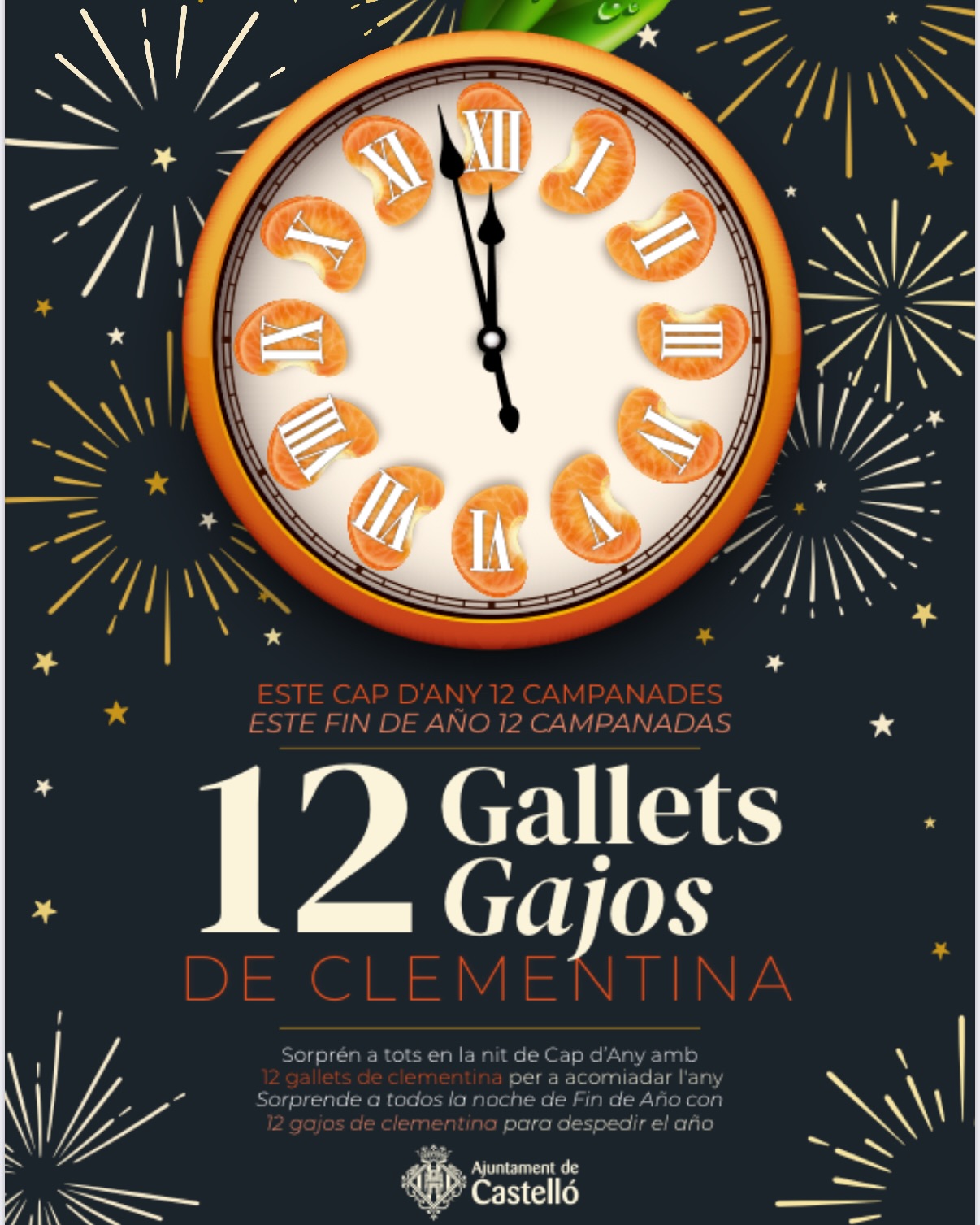Con este objetivo, el Ayuntamiento repartirá un total de 4.800 bolsitas, cada una con dos clementinas recién recolectadas de los naranjos de las partidas rurales de la ciudad. El reparto se realizará de manera gratuita, hasta fin de existencias, en tres puntos el día 31 de diciembre: la plaza Pescadería, a partir de las 10.30 horas, las Campanadas Infantiles en la Porta del Sol, desde las 11.00 horas; y la Nochevieja del Edificio del Reloj en el Grao.