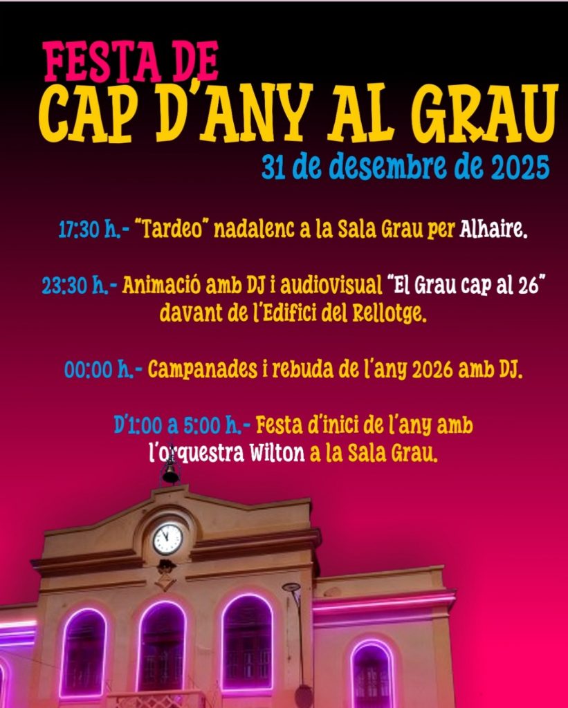 La celebración continuará por la noche, a partir de las 23.30 horas, con la actuación de un DJ y el audiovisual “El Grau hacia el 2026” en el Edificio del Reloj, que servirá como preámbulo para la llegada de las doce campanadas y la bienvenida al Año Nuevo. Tras el cambio de año, la fiesta se trasladará, de 1.00 a 5.00 de la madrugada, a la Sala Grau, donde tendrá lugar la Fiesta de inicio de 2026 con la animación de la orquesta Wilton, poniendo el broche final a una intensa y variada Nochevieja en el distrito marítimo.