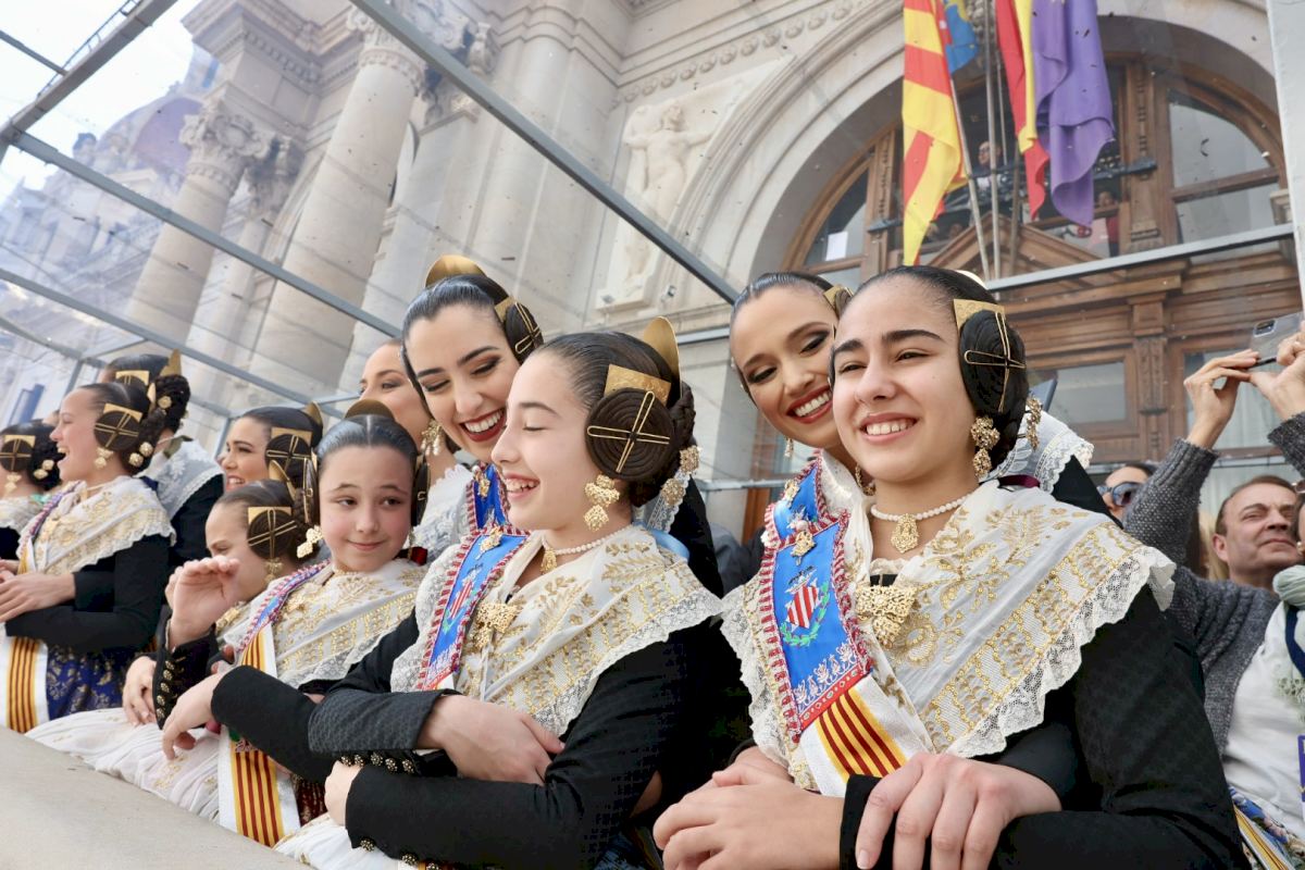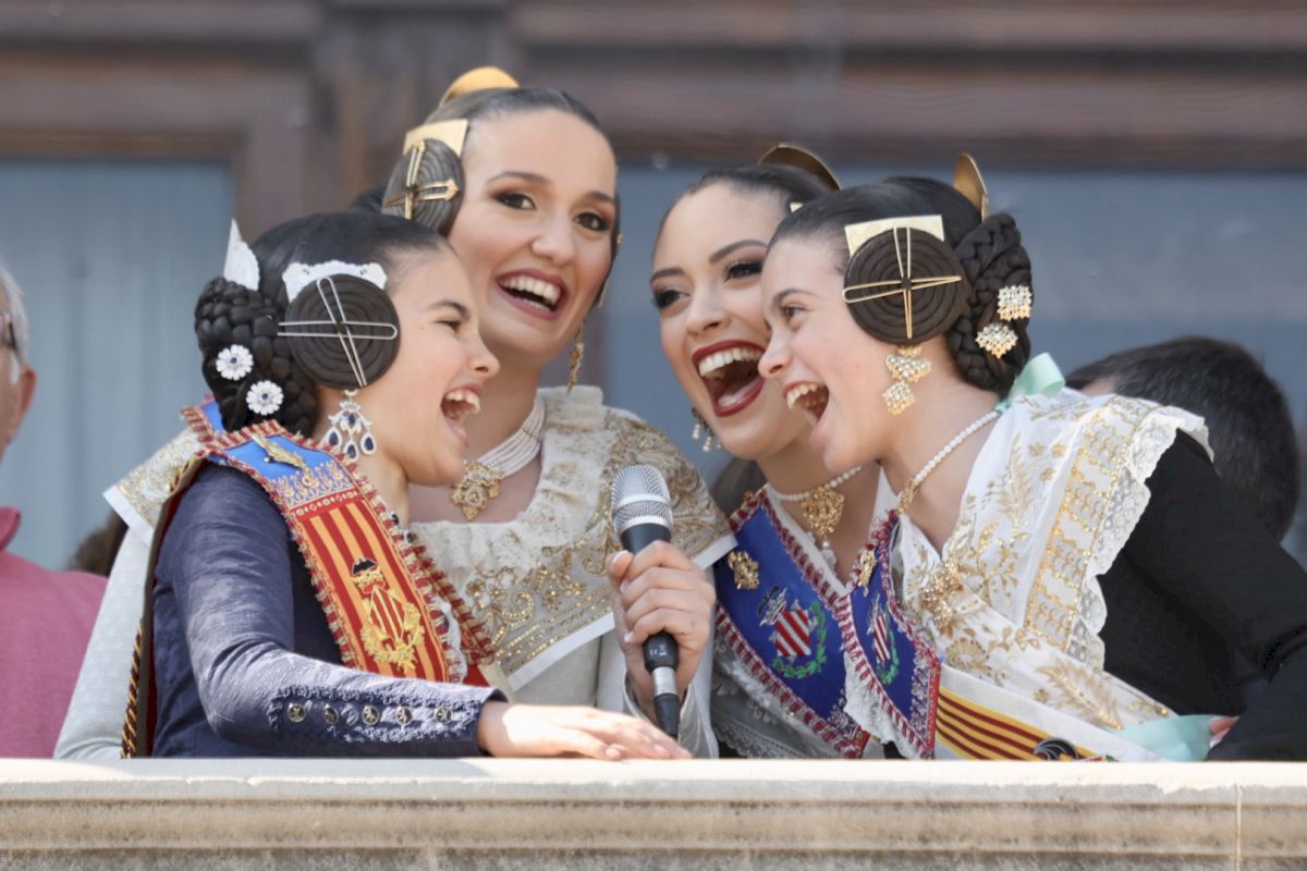 Los invitados al balcón del Ayuntamiento han sido: la delegada del Gobierno, Pilar Bernabé; el influencer valenciano Cabrafotuda; y los representantes de las Fallas Conde Salvatierra-Cirilo Amorós, Doctor Manuel Candela-Avenida del Puerto, Justo Vilar-Plaza Mercado Cabañal, San Vicente Mártir-Pianista Amparo Iturbi, San Pedro-Virgen de Vallivana, San Vicente-Marvà y Barraca-Travesía Iglesia del Rosario; además de las Juntas Locales Falleras de Llosa de Ranes, Náquera, Oliva, Moncada y l’Eliana.