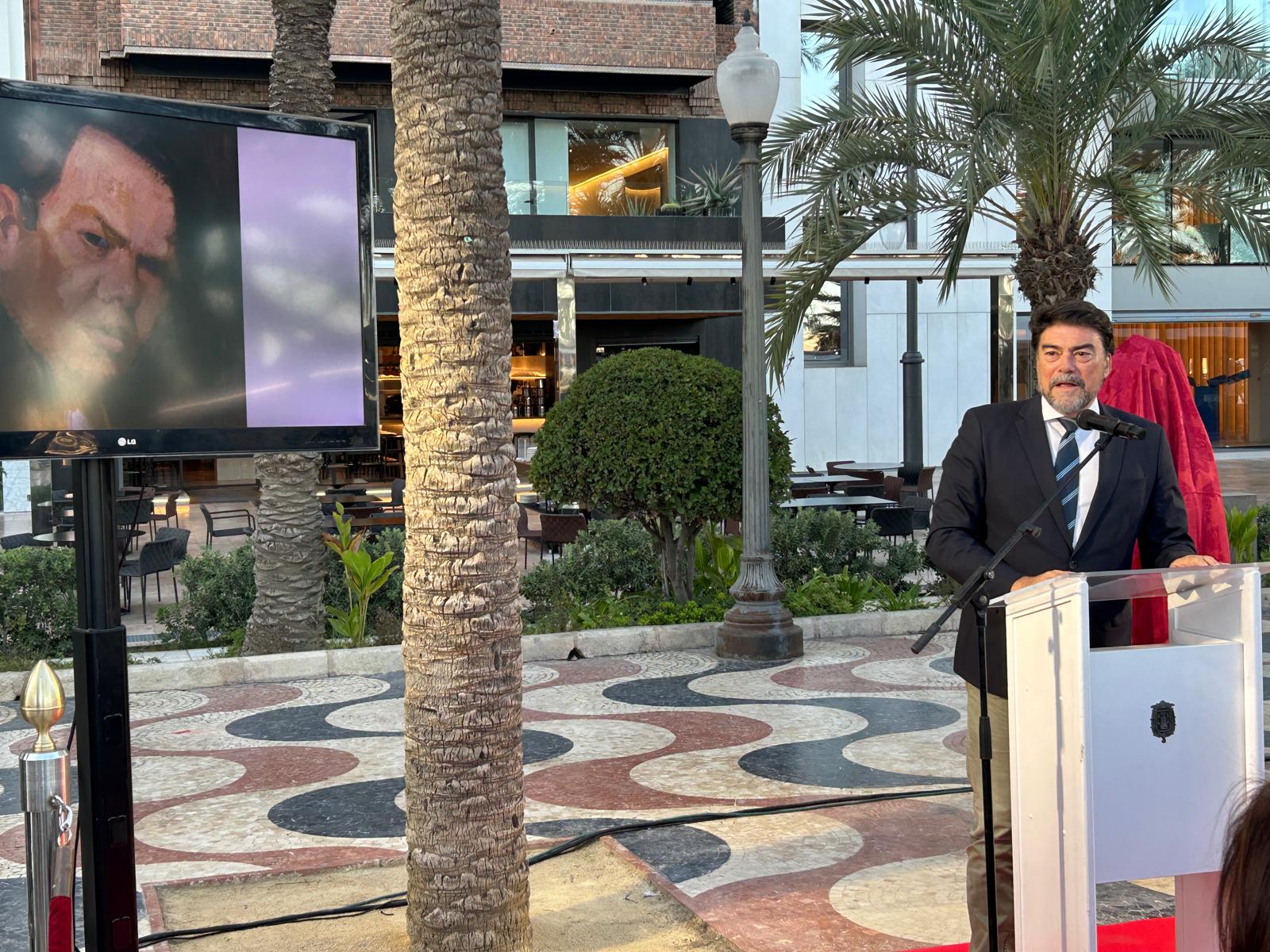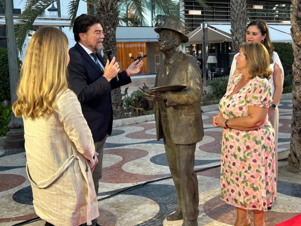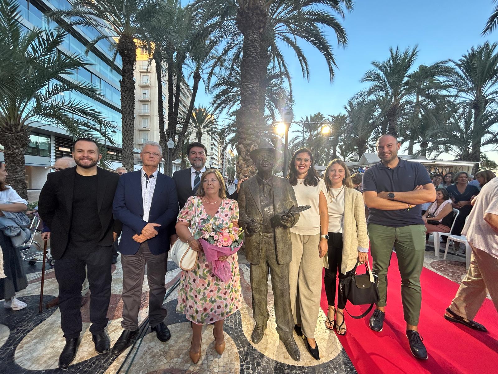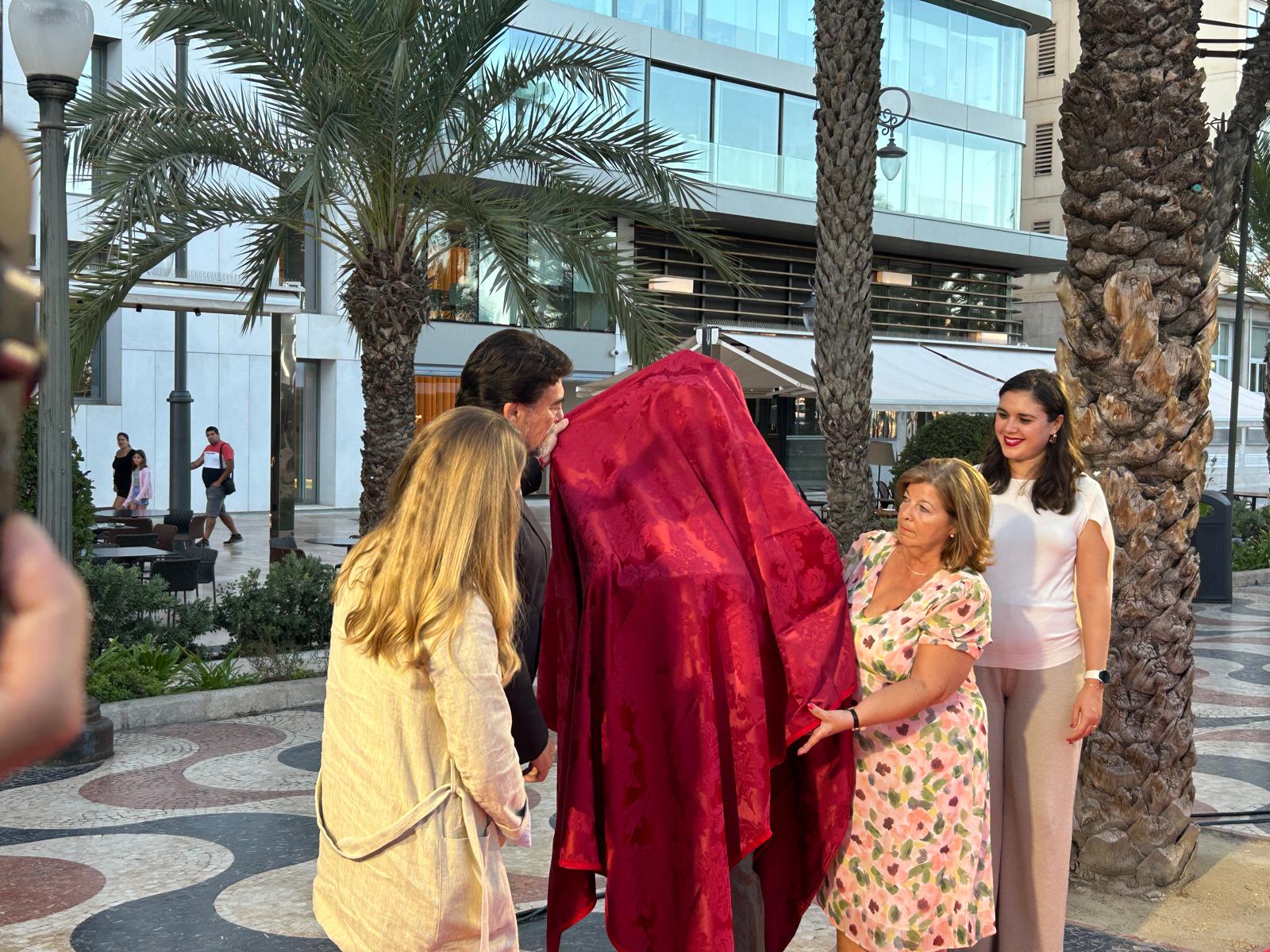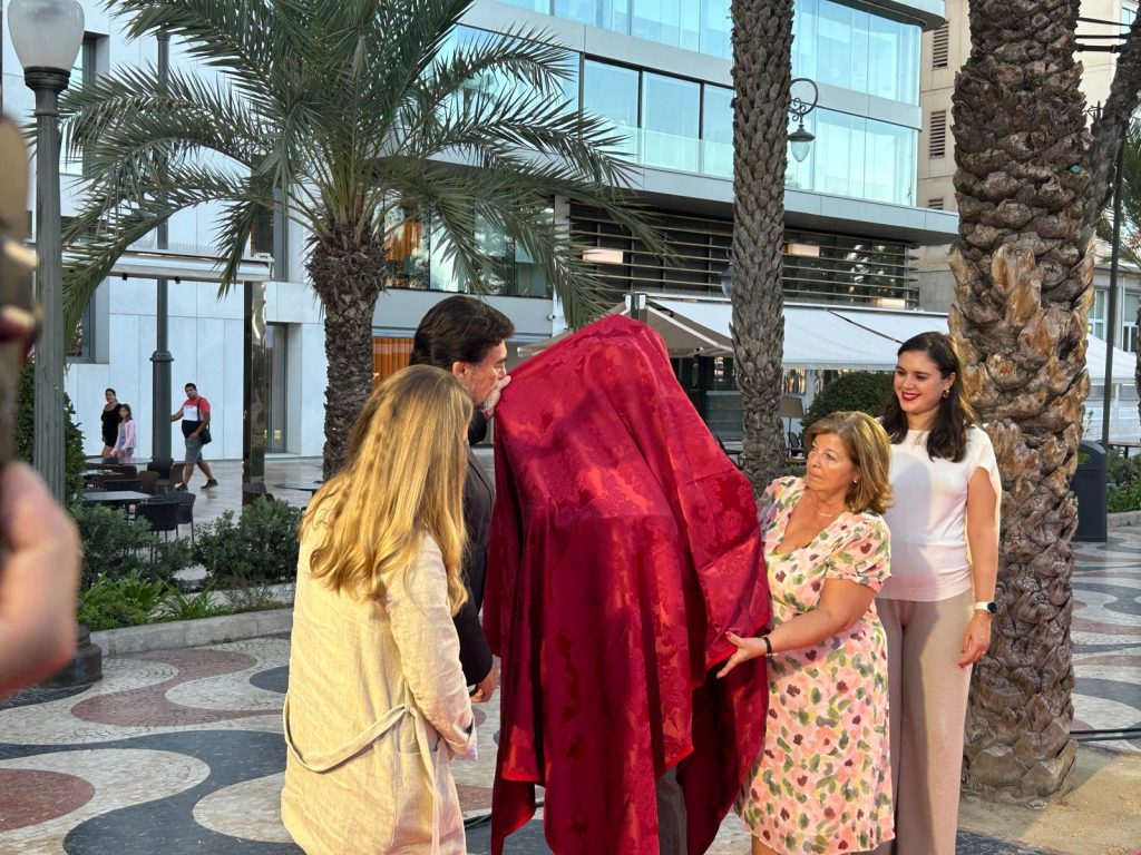 - El alcalde descubre una escultura de bronce de cuerpo entero, que representa al artista alicantino con una paleta y un pincel, junto su sobrina nieta Encarna Varela en la Explanada