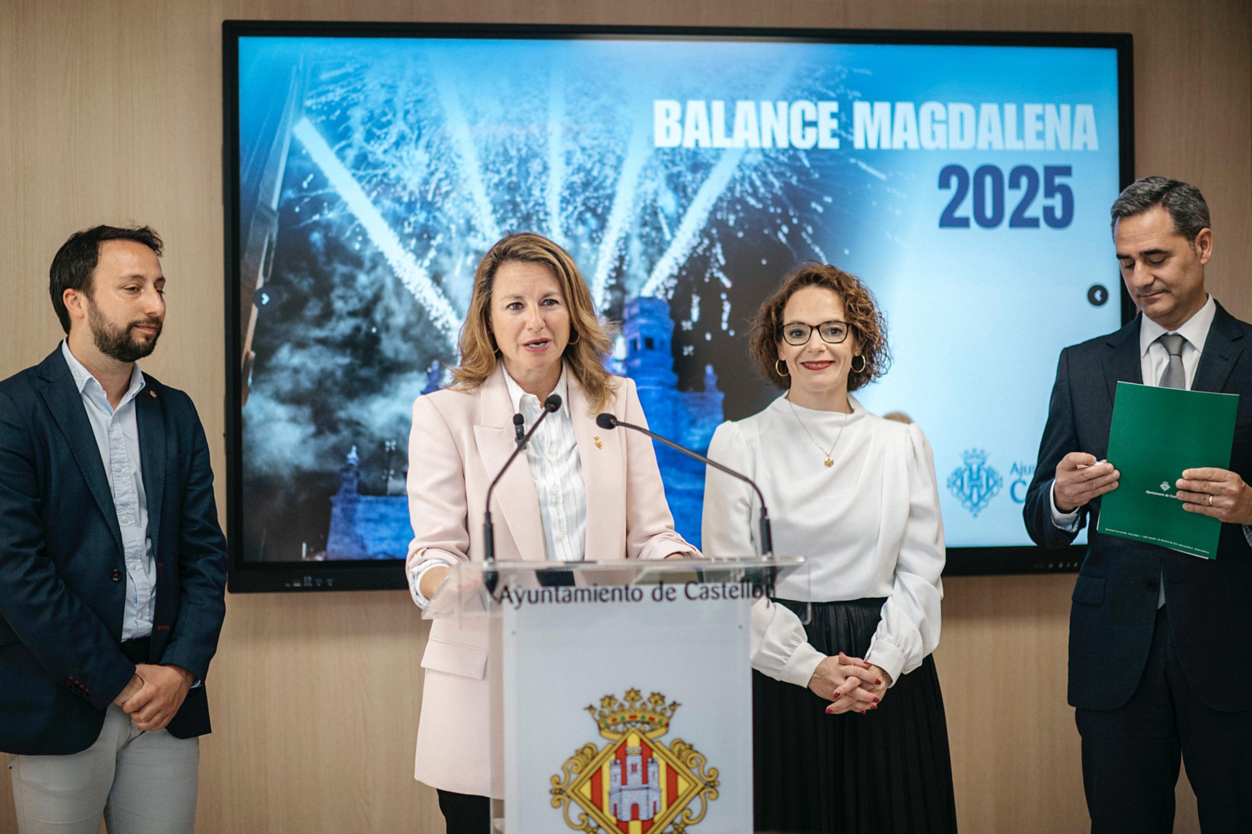 La alcaldesa de Castellón, Begoña Carrasco, ha hecho esta mañana balance de las Fiestas de la Magdalena 2025, en una rueda de prensa en la que también ha participado la concejala de Fiestas, Noelia Selma,  el concejal de Servicios Públicos, Sergio Toledo, y el de Seguridad y Emergencias, Antonio Ortolá.