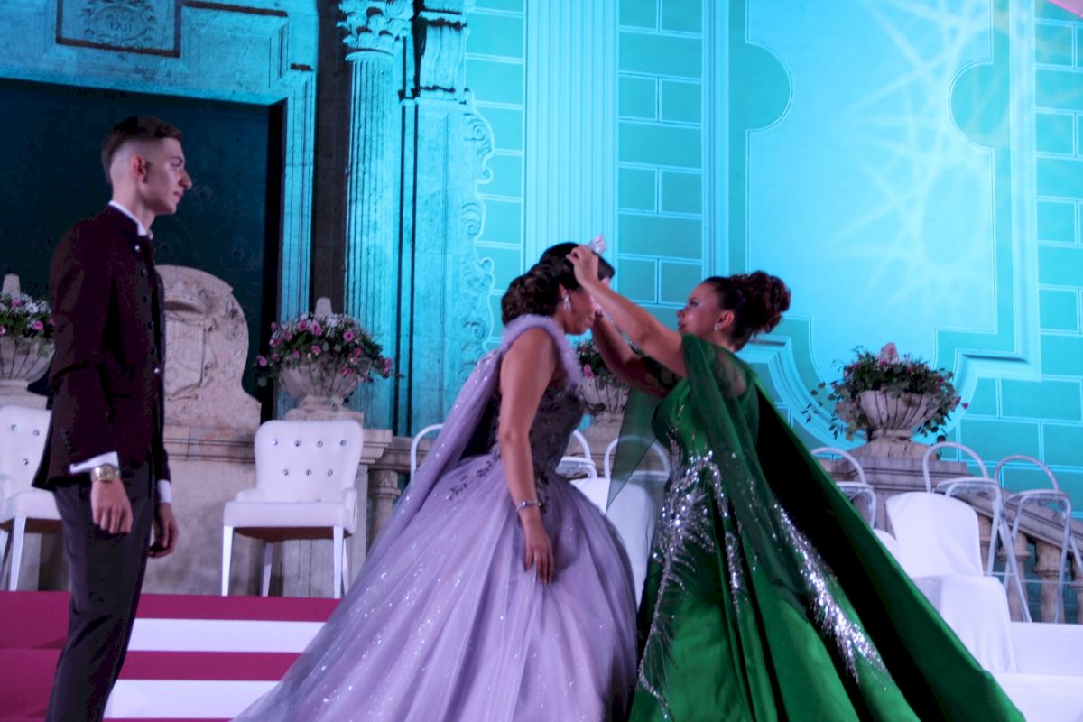 Tras los parlamentos de ambos para despedirse del cargo llegó el momento más esperado de la noche, la imposición de la corona que distingue a Ahinara como máxima representante de las fiestas de Benaguasil.
