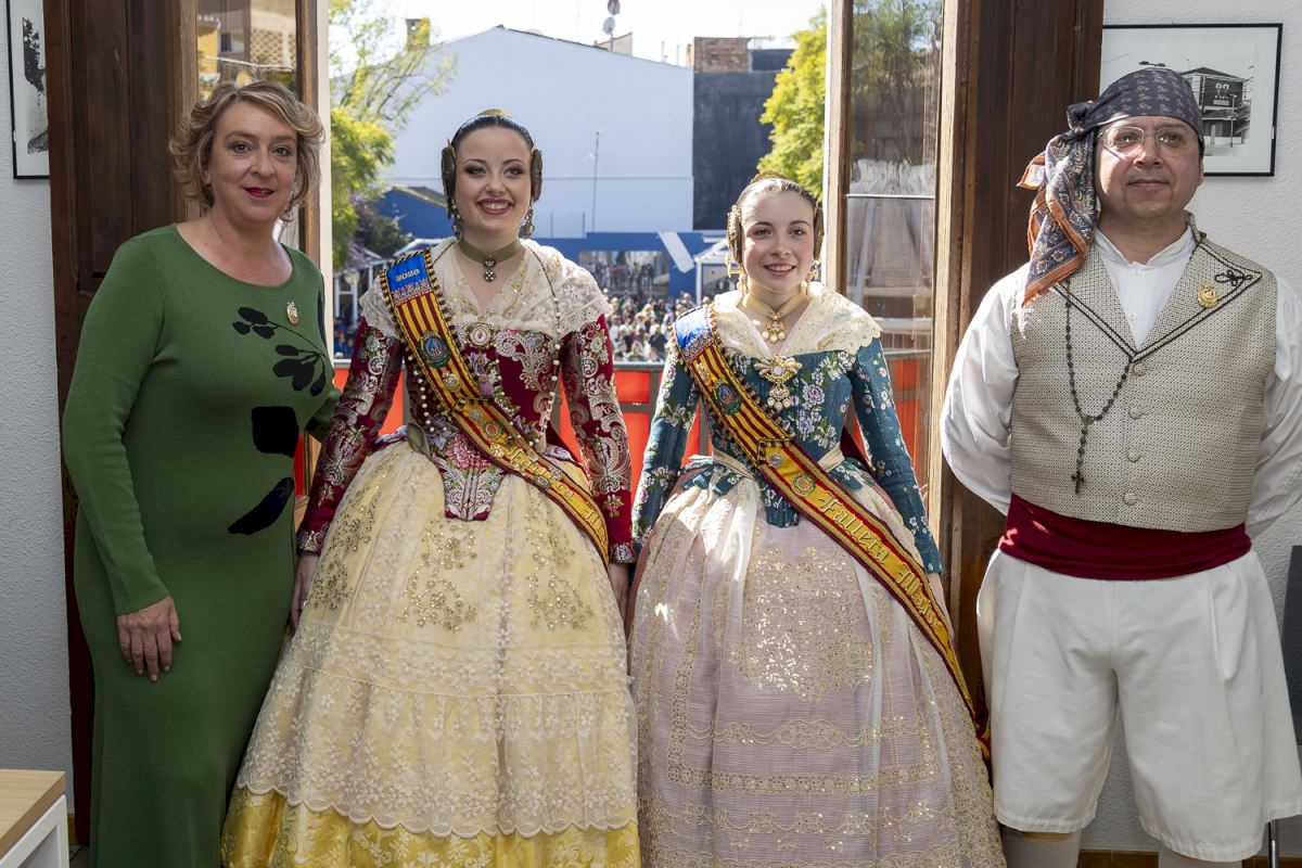 Continuando con la programación de actos, se llevó a cabo en la plaza del Ayuntamiento el tradicional intercambio de fotos entre las Falleras Mayores de la población y las máximas representantes de cada comisión, así como la entrega de las condecoraciones de los Bunyols d’or i brillants amb fulles de llorer.