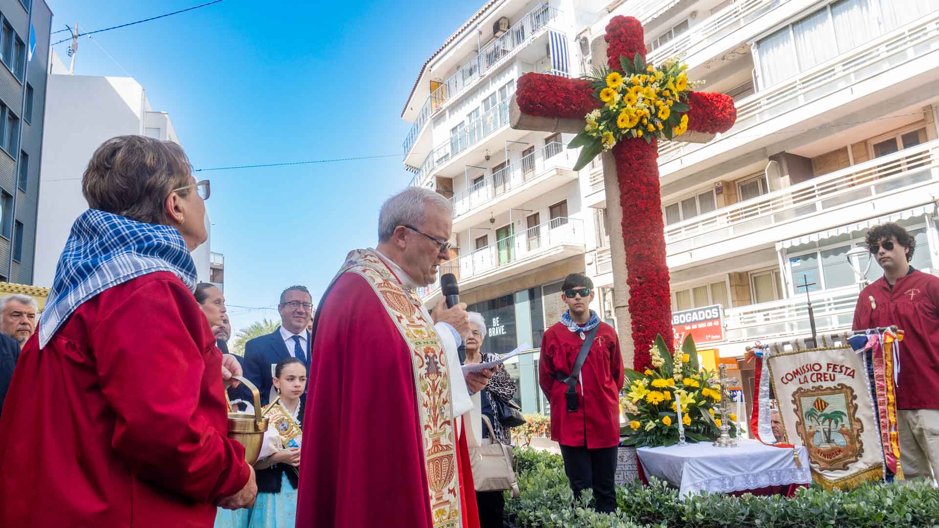 La jornada ha comenzado a las 8:00 horas con el repique de campanas en la iglesia de San Jaime y Santa Ana. Posteriormente, alrededor de las 11:00, autoridades y entidades festeras han desplazado en romería, acompañados por los Xirimiters de la Marina, hasta los pies de la cruz, donde el párroco, Juan Antonio González, ha realizado la bendición del término municipal.