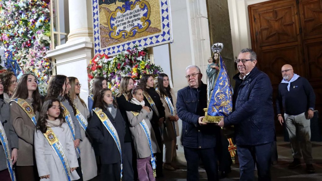 Al ritmo de ‘tabalet’ y ‘xirimita’, y tras escuchar la voz del recordado José Bayona, la ‘veu del temps’ en la Escenificación del Hallazgo, así como distintos cánticos en su honor, los ciudadanos han recibido la imagen de la patrona a las puertas de la iglesia, flanqueada por el alcalde de la ciudad, Toni Pérez; la concejal de Fiestas, Mariló Cebreros; las reinas de las Festes Majors Patronals de 2026, Laura Ivaris Marín y Carmen Guillem Campos; el presidente de la Comissió, Ramón Cano; y el cura párroco, Juan Antonio González.