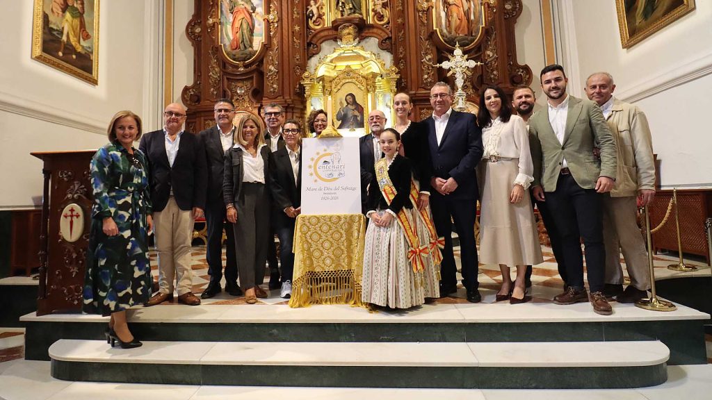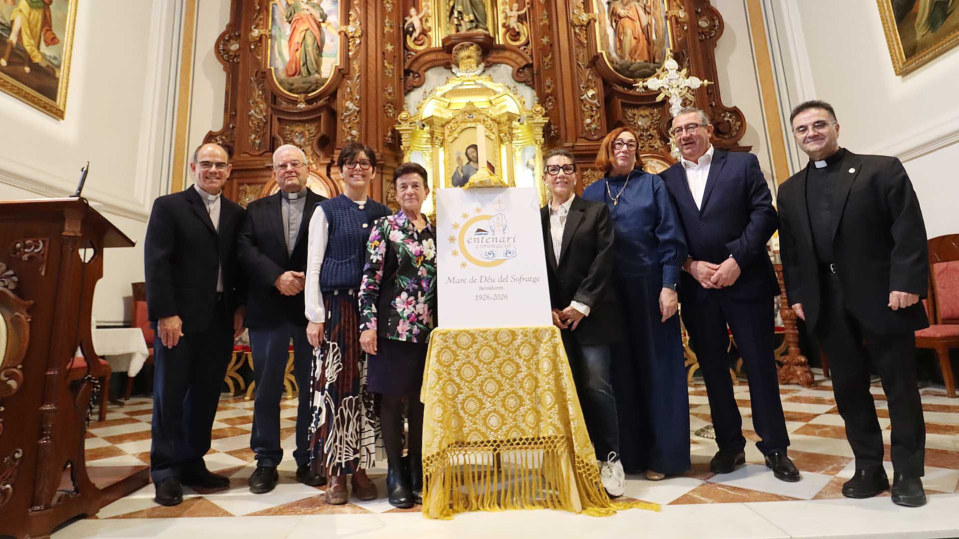 La iglesia de Sant Jaume i Santa Anna ha sido este mediodía escenario de la presentación del programa y del logotipo conmemorativo de los actos del Centenario de la Coronación de la Virgen del Sufragio como patrona de Benidorm, unos hechos que tuvieron lugar entre el 28 de octubre de 1925 y el 7 de febrero de 1926 y que la ciudad va a celebrar ahora con una extensa programación. El alcalde Toni Pérez; la edil de Fiestas, Mariló Cebreros, y otros ediles de la Corporación local; y los diputados autonómicos José Ramón González de Zárate y Manuel Pérez Fenoll, han acompañado al Consejo Parroquial en esta presentación. En ella también han participado las reinas de las Festes Majors Patronals, Paula Pascual Sánchez y Aitana Pérez Gutiérrez; el vicario episcopal en la Marina Baixa, Juan Bautista Samper; las Camareres de la Mare de Déu del Sofratge; y numerosos ciudadanos y devotos de la Virgen del Sufragio.
