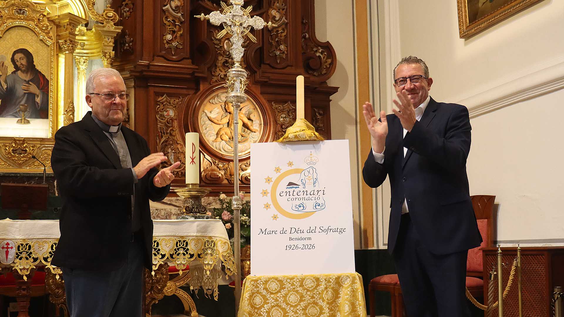 Toni Pérez y el párroco de Sant Jaume i Santa Anna, Juan Antonio González, han sido los encargados de descubrir la imagen del logotipo encargado por la parroquia para el Centenario de la Coronación, que ha sido creado por la benidormense Mari Carmen Zaragoza.
