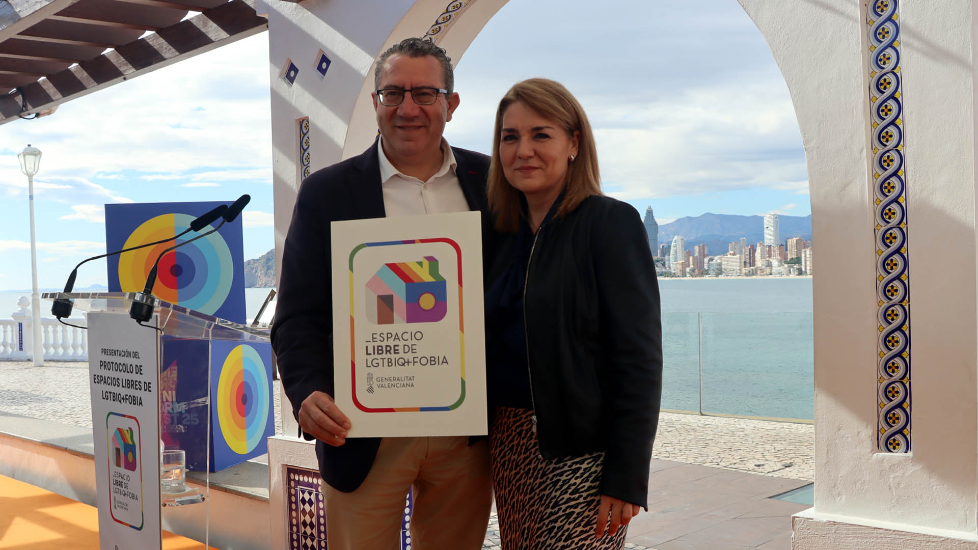 Benidorm se ha convertido hoy en el primer municipio de la Comunitat Valenciana en recibir el nuevo distintivo como Espacio Libre de LGTBIQ+fobia, una distinción creada por la Generalitat Valenciana para reconocer a instituciones, entidades y empresas comprometidas en garantizar un entorno seguro y libre de discriminación para todas las personas, independientemente de su orientación sexual o identidad de género. El alcalde de la ciudad, Toni Pérez, ha recogido este distintivo de la mano de la vicepresidenta primera del Consell y consellera de Servicios Sociales, Igualdad y Vivienda, Susana Camarero, quien ha destacado que, por méritos propios, “Benidorm, como tierra acogedora, de libertad y de vanguardia, debía ser el primer municipio de la Comunitat en unirse a este Protocolo de Espacios Libres de LGTBIQ+fobia”.