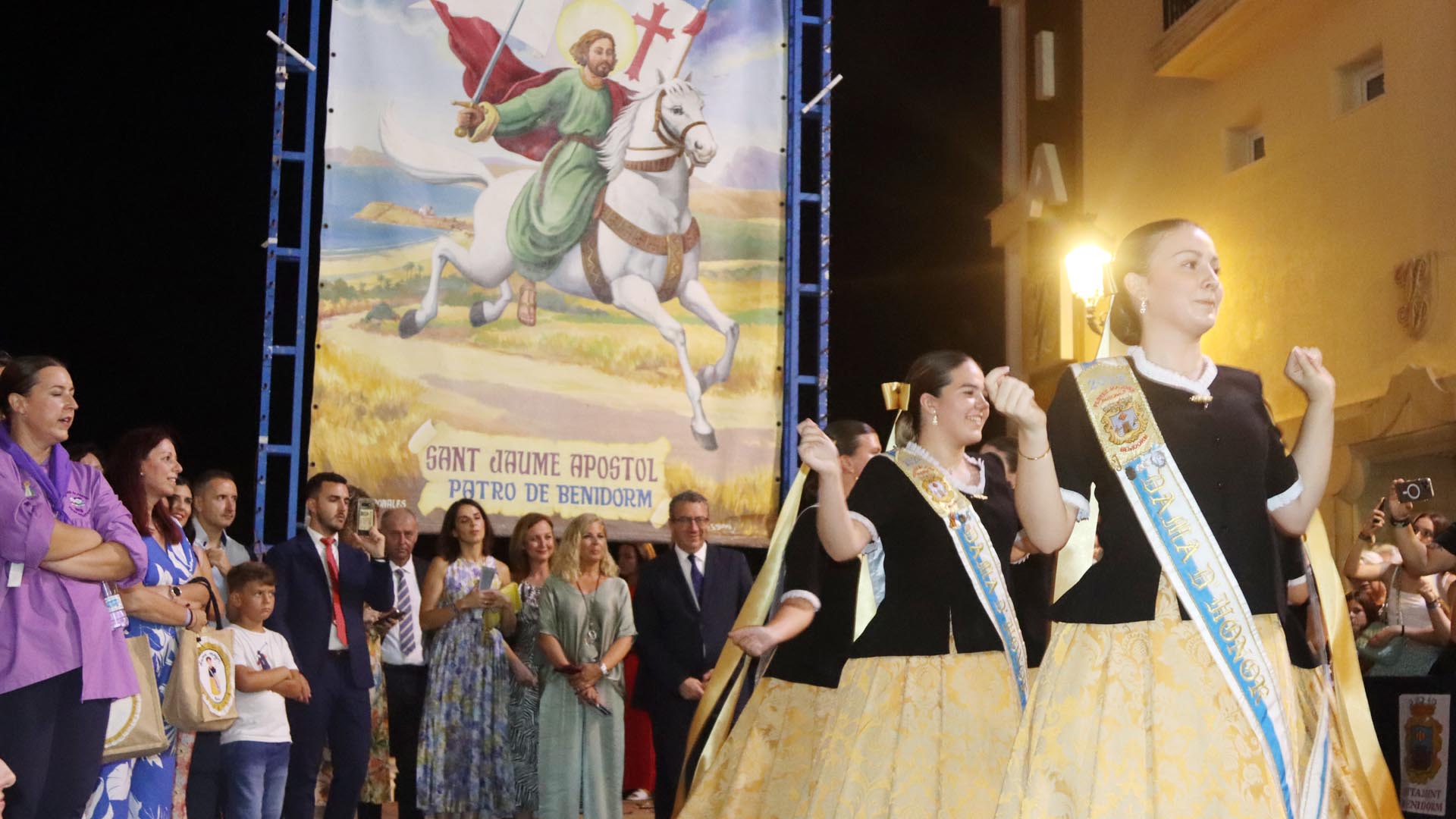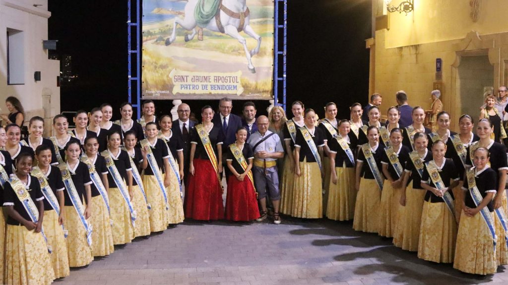 Como cada 25 de julio, Benidorm festejó ayer al patrón, Sant Jaume Apòstol, con un completo programa de actos que incluyó la presentación del cartel anunciador de las próximas Festes Majors Patronals de 2023, obra de la joven artista local Pilar Arroyo, que además forma parte de la Comissió. Sobre las 19.30 horas, el alcalde, Toni Pérez, y las Reinas Mayor e Infantil de les Festes, Angélica Morenilla y Daniela Talavera, descubrieron el cartel, que durante todo el año lucirá en la fachada del centro municipal El Torrejó y que recoge toda la simbología de la fiesta en torno a lo ocurrido el 16 de marzo de 1740, cuando de la patrona, la Mare de Déu del Sofratge, llegó a Benidorm.