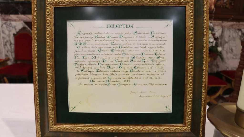 La ciudad de Benidorm comenzó ayer por la tarde los actos organizados con motivo del centenario de la proclamación y coronación como patrona a la Virgen del Sufragio. Un 9 de diciembre de hace 100 años el Papa Pio XI firmó en Roma el rescripto pontificio que proclamaba a la Virgen del Sufragio como patrona de la ciudad. Se trataba de una decisión papal en respuesta a una solicitud que había formalizado el 28 de octubre de 1925 el párroco Juan Segarra, la cual fue apoyada por el Ayuntamiento, con Vicente Llorca Alós de alcalde.