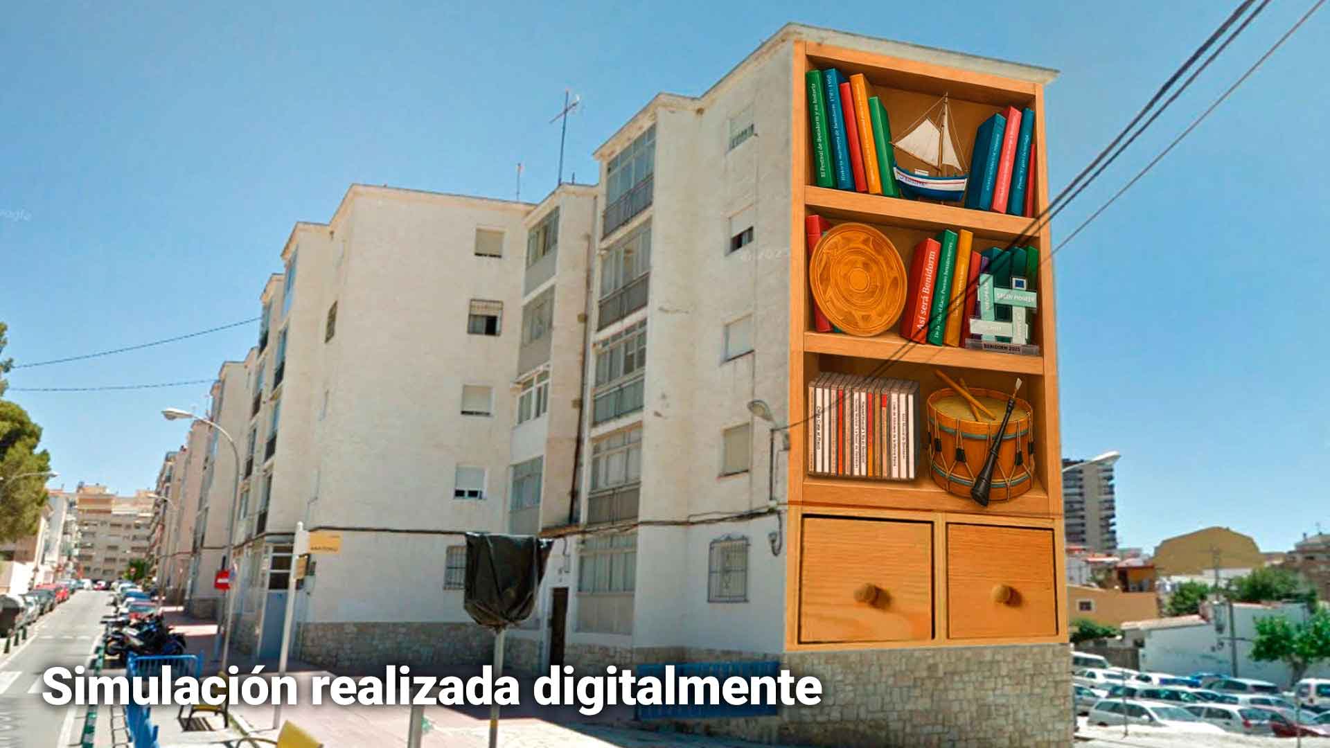 Concretamente, los murales reproducen dos estanterías donde se almacenan libros, discos de música y otros objetos decorativos, entre ellos una de las emblemáticas columnas del Castell; el busto de la diosa Tanit; los cisnes de Hung-Yi; un tabalet y una xirimita; el plato de los peces encontrado en el Tossal de La Cala; el símbolo de la certificación como destino Pionero Verde del Turismo Inteligente otorgado este 2025 a la ciudad por la Comisión Europea y una pequeña embarcación que representa a la Asociación Cultural y Recreativa La Barqueta.