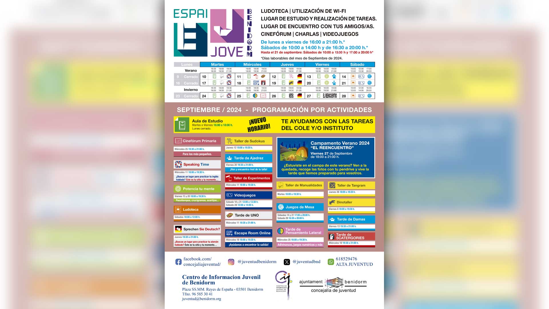 La Concejalía de Juventud del Ayuntamiento de Benidorm ya ha completado la programación del mes de septiembre del Espai Jove, un servicio cuyo principal objetivo es facilitar a todos los jóvenes un espacio en el que, además de poder realizar sus tareas escolares con el apoyo y ayuda de los monitores, también sirva como punto de encuentro y reunión con otros jóvenes y llevar a cabo actividades programadas de ocio educativo como talleres de manualidades, cinefórum, charlas, videojuegos, ludoteca, cuentacuentos, aprendizaje de idiomas, etc.