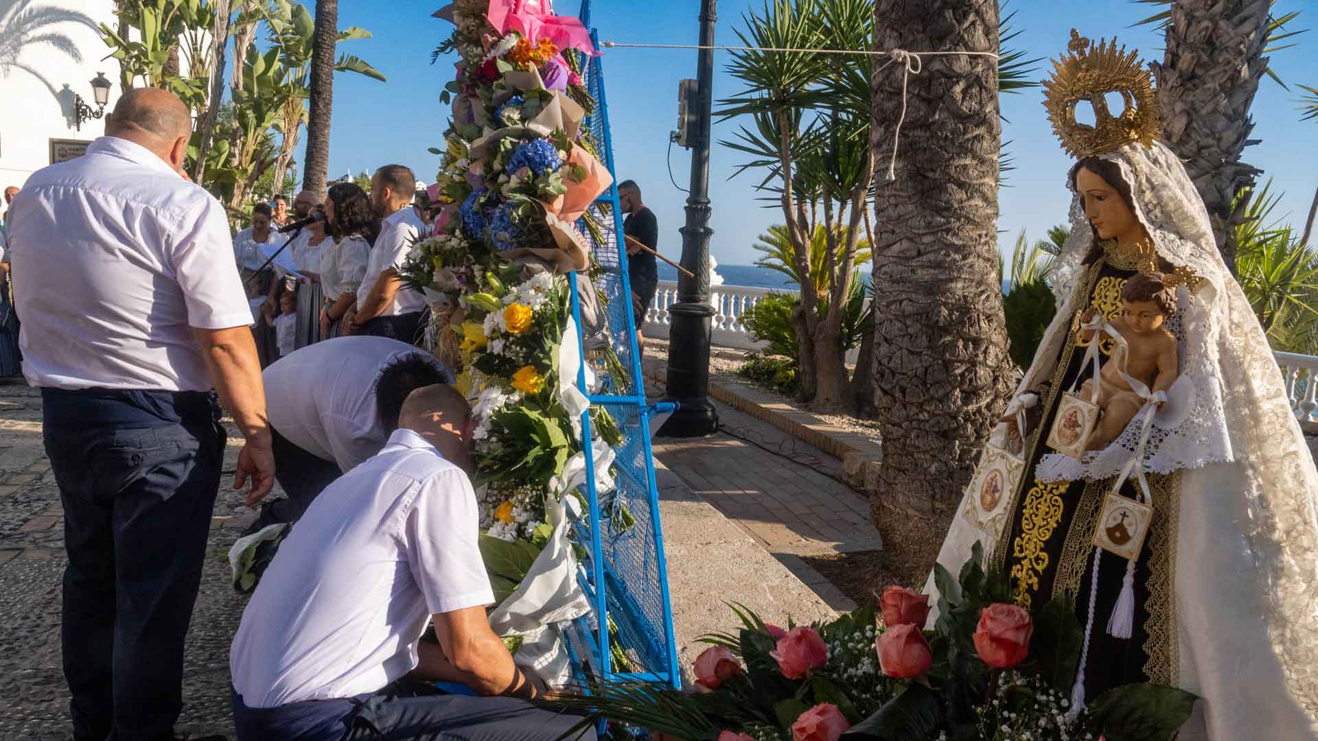 Ya en la Plaça de la Senyoria, tuvo lugar la ofrenda de flores a la Virgen en la que participaron, además de los citados, la asociación Mujeres 2000 y la Falla Benidorm Centro y, a continuación, a los pies de la fuente del Monumento a los Caídos en la Mar, se lanzaron coronas de laurel.