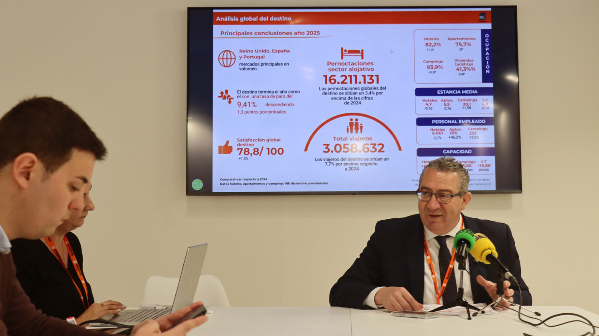 Benidorm consolidó en 2025 un nuevo año de crecimiento para la industria turística, superando la barrera de los 3 millones de turistas y los 16 millones de pernoctaciones, gracias en buena medida al impulso de los mercados internacionales. Así se desprende del informe anual de Visit Benidorm que el alcalde de la ciudad, Toni Pérez, y la gerente de la fundación, Leire Bilbao, han trasladado este miércoles durante la jornada inaugural de la Feria Internacional de Turismo de Madrid (Fitur) 2026, una edición marcada por el luto oficial decretado tras el trágico accidente ferroviario de Adamuz y que ha arrancado con un minuto de silencio en recuerdo de las víctimas y sus familiares.