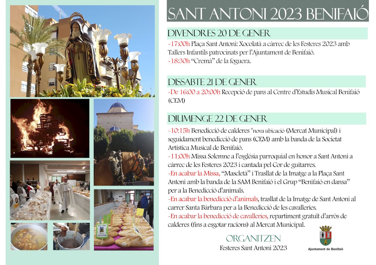 El domingo 22 de enero durante toda la mañana la fiesta en honor a Sant Antoni será completa. Hacia las 10:15h está prevista la bendición de los panes y las típicas calderas como acto previo a la solemne misa en honor del santo a las 11:00h en la iglesia parroquial. Tras el acto religioso se dará inicio a la participativa bendición de animales en la Plaza de ‘Sant Antoni’ donde los vecinos podrán llevar a su mascota para ser bendecida y a continuación se realizará la bendición de las caballerías en la calle Santa Bárbara. En esta jornada festiva en honor al patrón de los animales participará el grupo “Benifaió en dansa”.