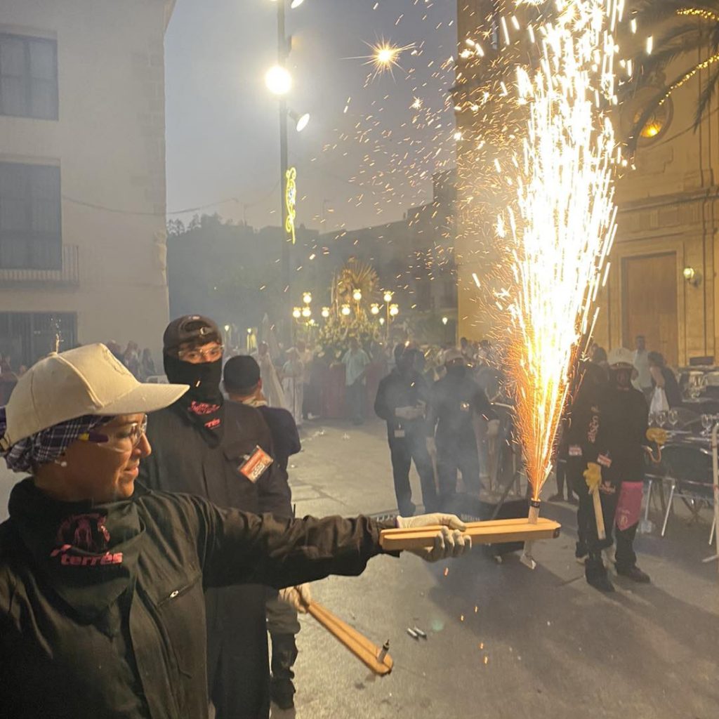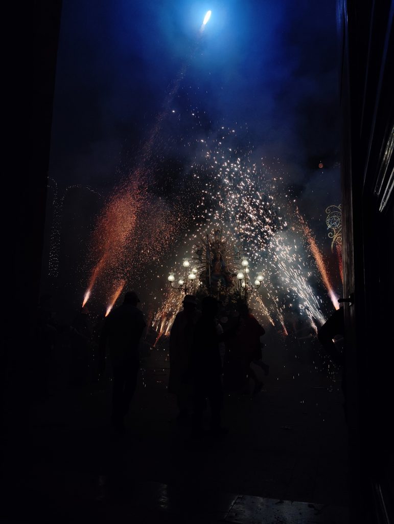 Los jóvenes Clavarios de la Divina Aurora, así como las Clavariesas de la Mare de Déu d´Agost, además de vecinos y miembros de las Peñas El Xiflec y El Coet, salieron de nuevo en procesión con la indumentaria adecuada para lanzar centenares de cohetes que daban paso a la imagen a través del fuego y la pólvora.