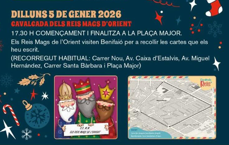 El municipio de Benifaió está inmerso estos días en una amplia actividad de ocio y diversión para los más pequeños que finalizará la noche del 5 de enero con la cabalgata de los Reyes Magos de Oriente que saldrá a las 17:30h desde el colegio Santa Bárbara y que finalizará en la Plaza Mayor con la entrega de cartas de los más pequeños a Sus Majestades reales.