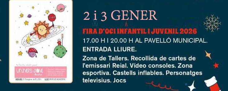 Hasta entonces, multitud de actividades todavía por delante como el UNIVERS JOVE, una amplia oferta de ocio infantil y juvenil con talleres, videoconsolas, actividades deportivas y castillos hinchables que tendrá lugar los días 2 y 3 de enero de 17:00h a 20:00h, con entrada libre, en el pabellón municipal.