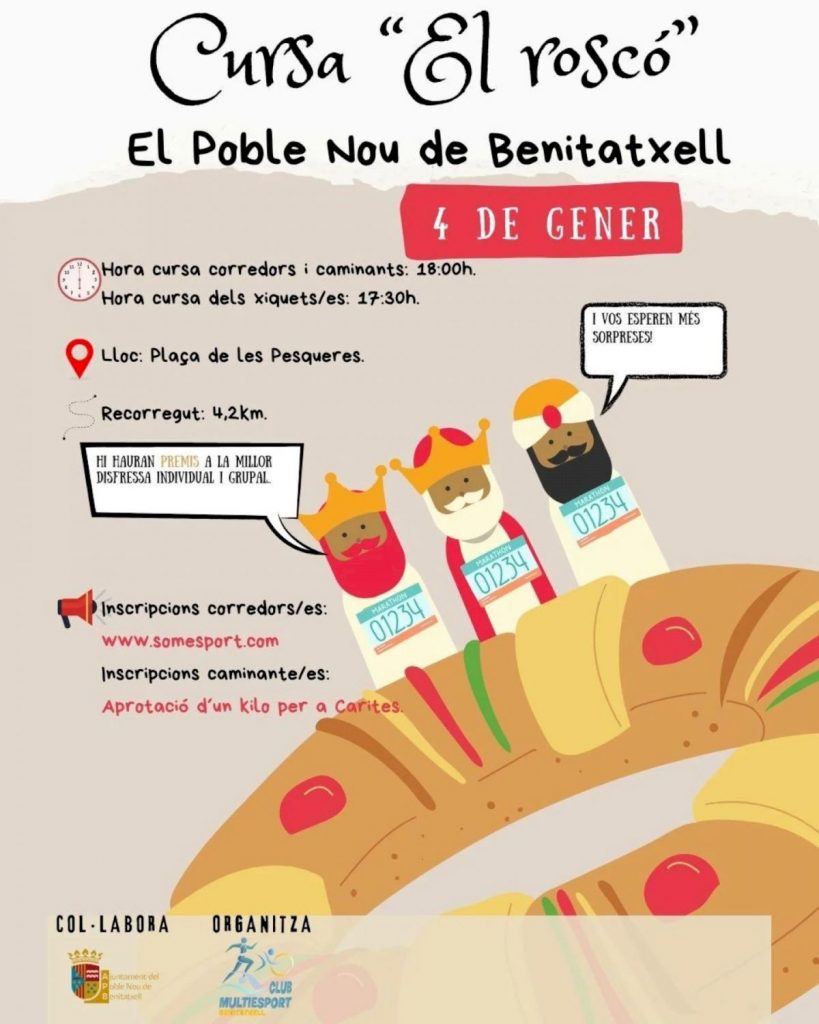 El sábado 4 llega la Carrera ‘El roscó’ organizada por el Club Multiesport Benitatxell. Dará comienzo a las 17:30h en la plaza de les Pesqueres con una carrera para niños y niñas, y a las 18:00h será el turno de las personas adultas. Habrá premios para el mejor disfraz grupal e individua y una pequeña merienda para las personas participantes.