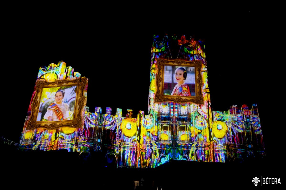 Les teles dels vestits de fallera projectats en la silueta del Castell han donat pas a unes imatges de l’Ofrena de Bétera on s’ha pogut veure a la Verge dels Desemparats representada en els taulells típics de Bétera.