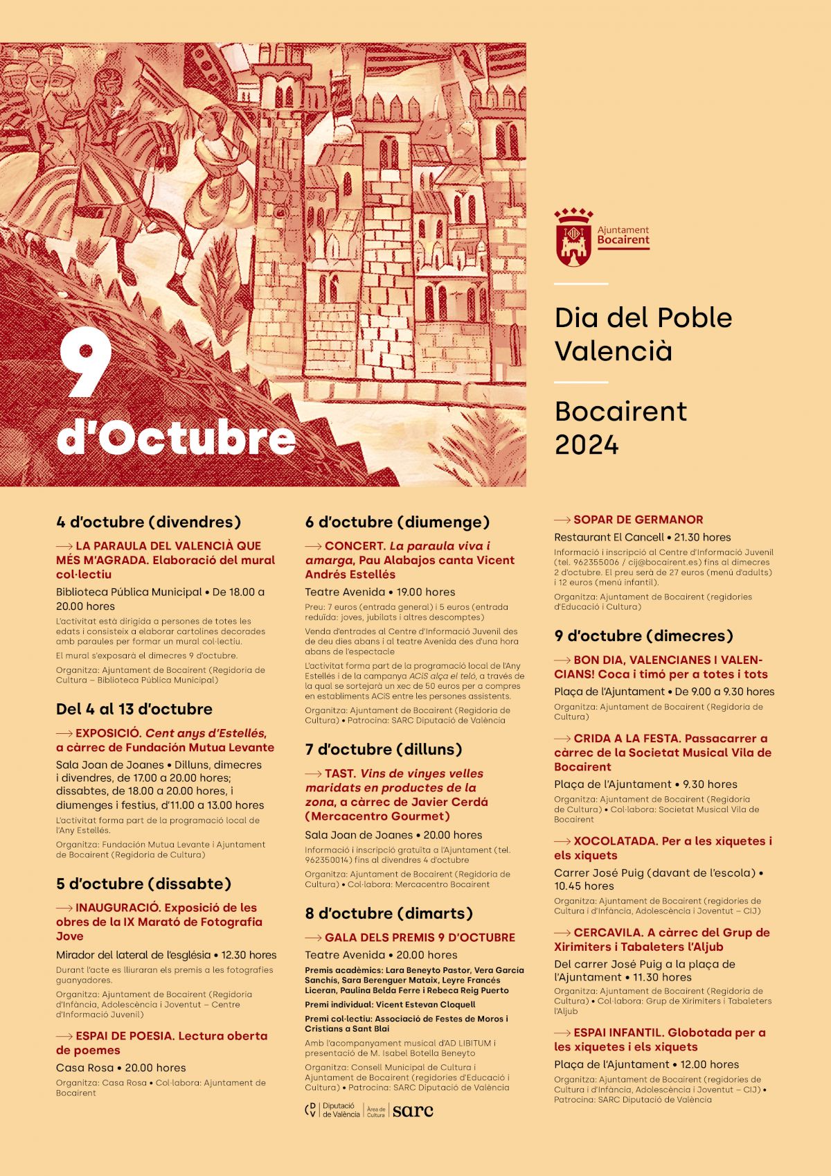 Durant el cap de setmana, tindrà lloc la inauguració de la mostra de la IX Marató de Fotografia Jove, l’Espai de Poesia i el concert de Pau Alabajos “La paraula viva i amarga”, dedicat també al poeta de Burjassot. Al seu torn, el dilluns dia 7 hi haurà un tast de vins de proximitat i, el dia 8, el teatre Avenida acollirà la gala de lliurament dels premis 9 d’Octubre.