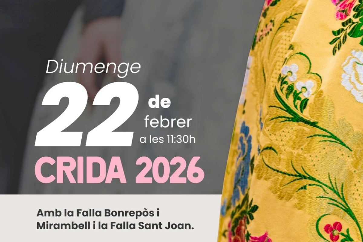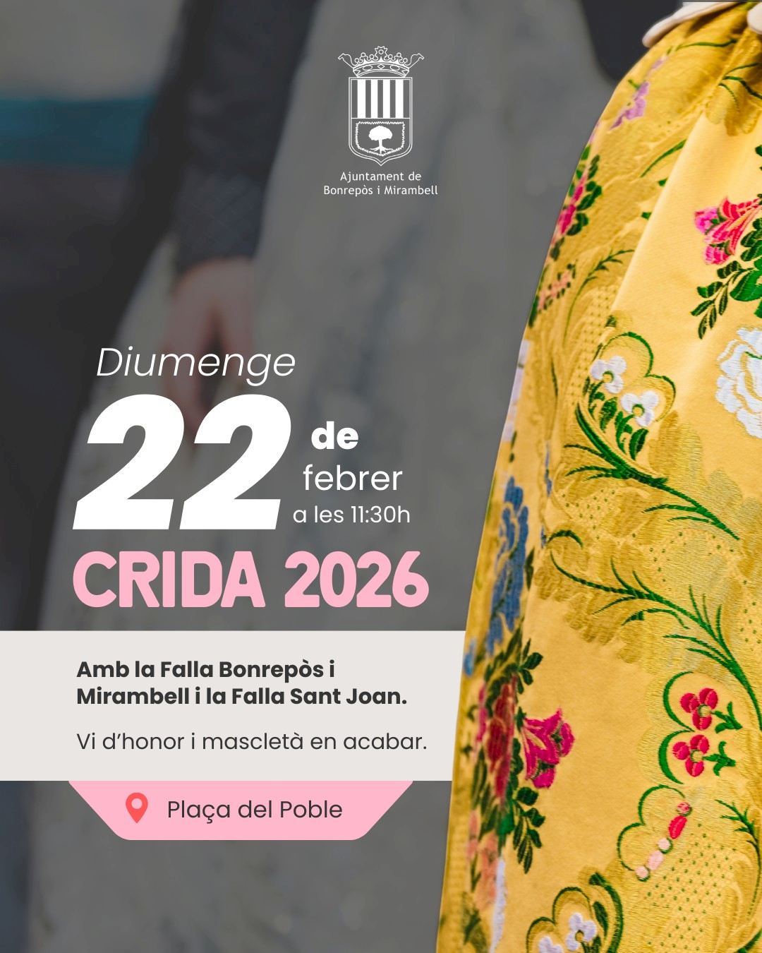 L’Ajuntament de Bonrepòs i Mirambell ultima els preparatius per a donar el tret d’eixida oficial a les Falles. Aquest pròxim diumenge, 22 de febrer, el municipi celebrarà la seua tradicional Crida, un acte solemne i festiu on les Falleres Majors del municipi conviden als veïns a gaudir de les Falles 2026.