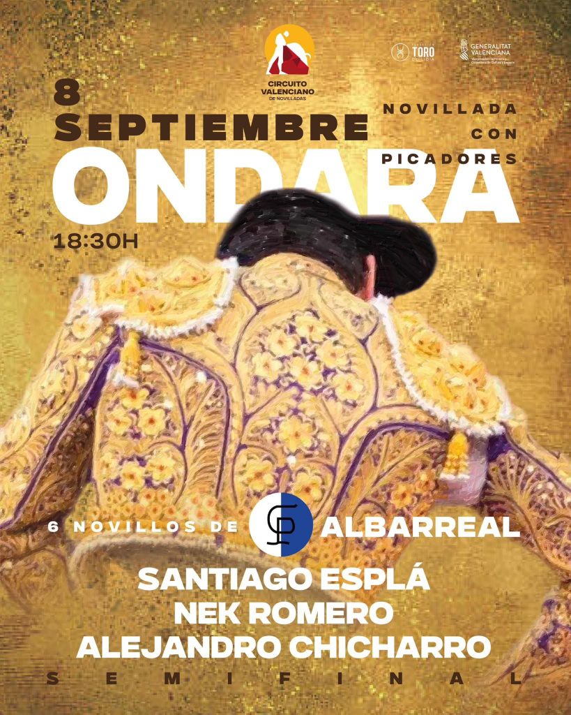 El domingo 8 de septiembre se lidiarán novillos de Albarreal, procedencia Marqués de Domecq, en Ondara. Compondrán el cartel Santiago Esplá, Nek Romero y Alejandro Chicharro. Sobre la importancia del reto para el alicantino, hay que señalar que Nek Romero tomará la alternativa en octubre en Valencia, coincidiendo con la despedida de los ruedos de Enrique Ponce. Ocupa el séptimo puesto en el escalafón con nueve novilladas. Chicharro es noveno, con ocho festejos en su haber. Esplá figura en el puesto 61 con solo dos paseíllos.