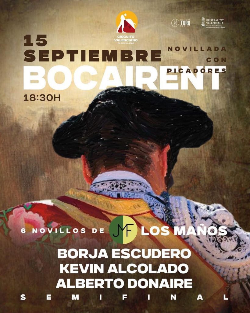 Borja Escudero y Kevin Alcolado harán el paseíllo el 15 de septiembre en Bocairent en compañía de Alberto Donaire para estoquear utreros de Los Maños, origen Santa Coloma. Alcolado, con dos novilladas, ocupa el puesto 52 del escalafón. Donaire, con un festejo, se sitúa en el 100. El novillero triunfador de cada una de los dos tardes y el segundo con mayor puntuación se clasificarán directamente para la final del domingo 29 de septiembre en Villena.