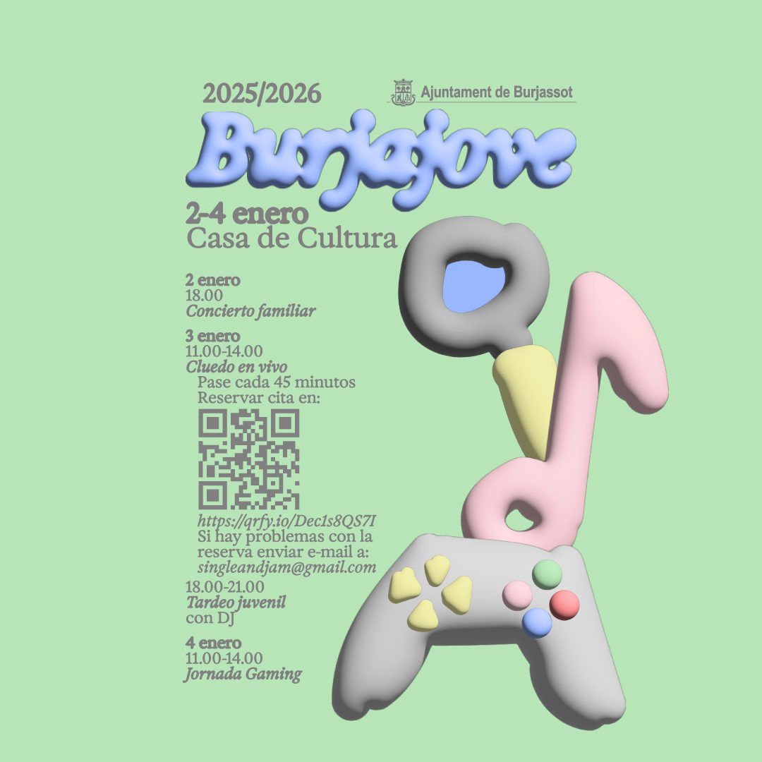 El área de Cultura y Juventud del Ayuntamiento de Burjassot, de manos de la Concejalía dirigida por Javier Naharros, ya lo tiene todo listo para que, del 2 al 4 de enero, pequeños y jóvenes disfruten de la Burjajove 2026, el proyecto en el que la música, los talleres, el tardeo para los jóvenes o la jornada de gaming van a ser los protagonistas de la edición de este año.