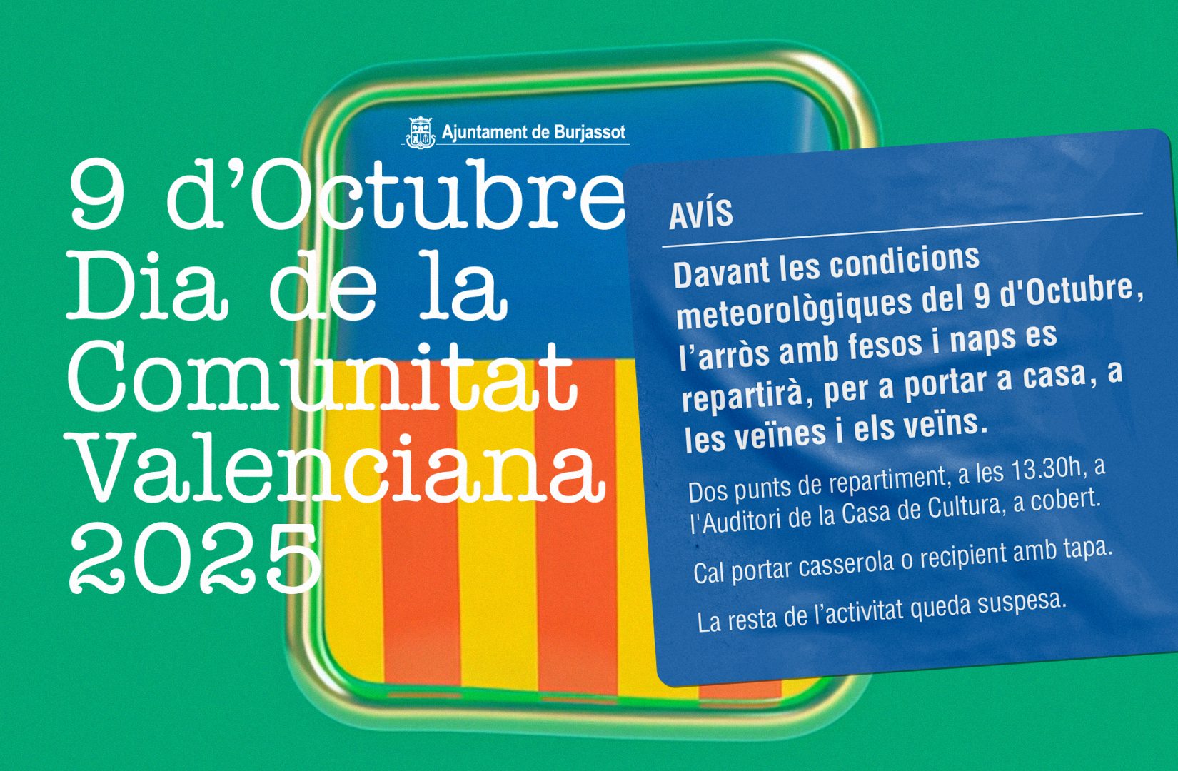 Las condiciones meteorológicas desfavorables que se prevén desde la tarde del miércoles 8 de octubre, han hecho que el Ayuntamiento de Burjassot tome la decisión de modificar el programa festivo del 9 d’Octubre, Día de la Comunidad Valenciana.