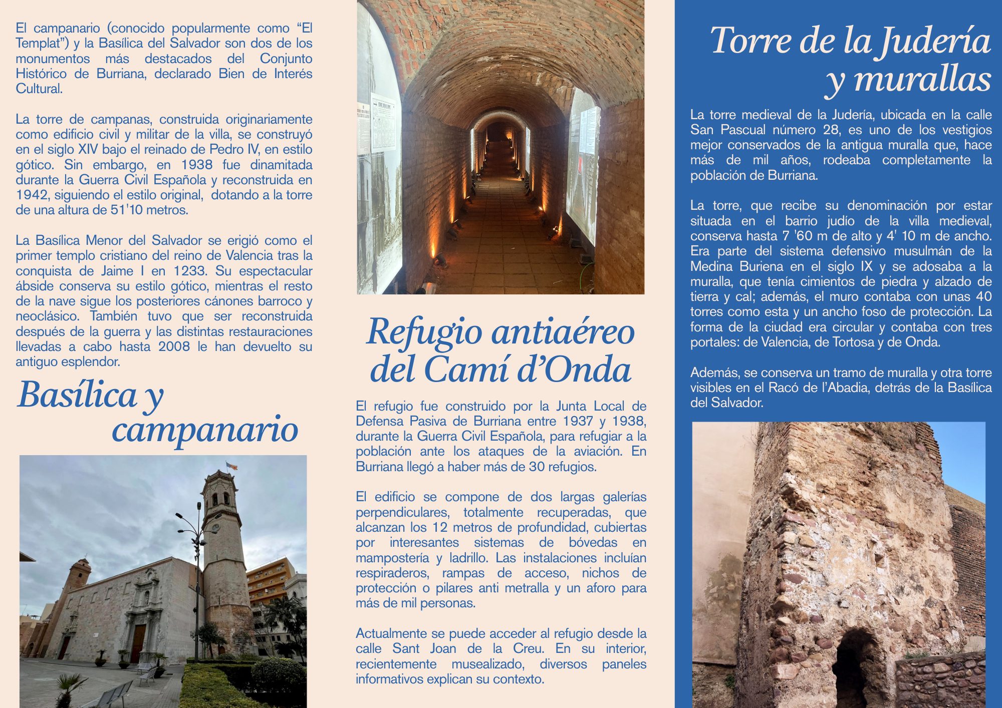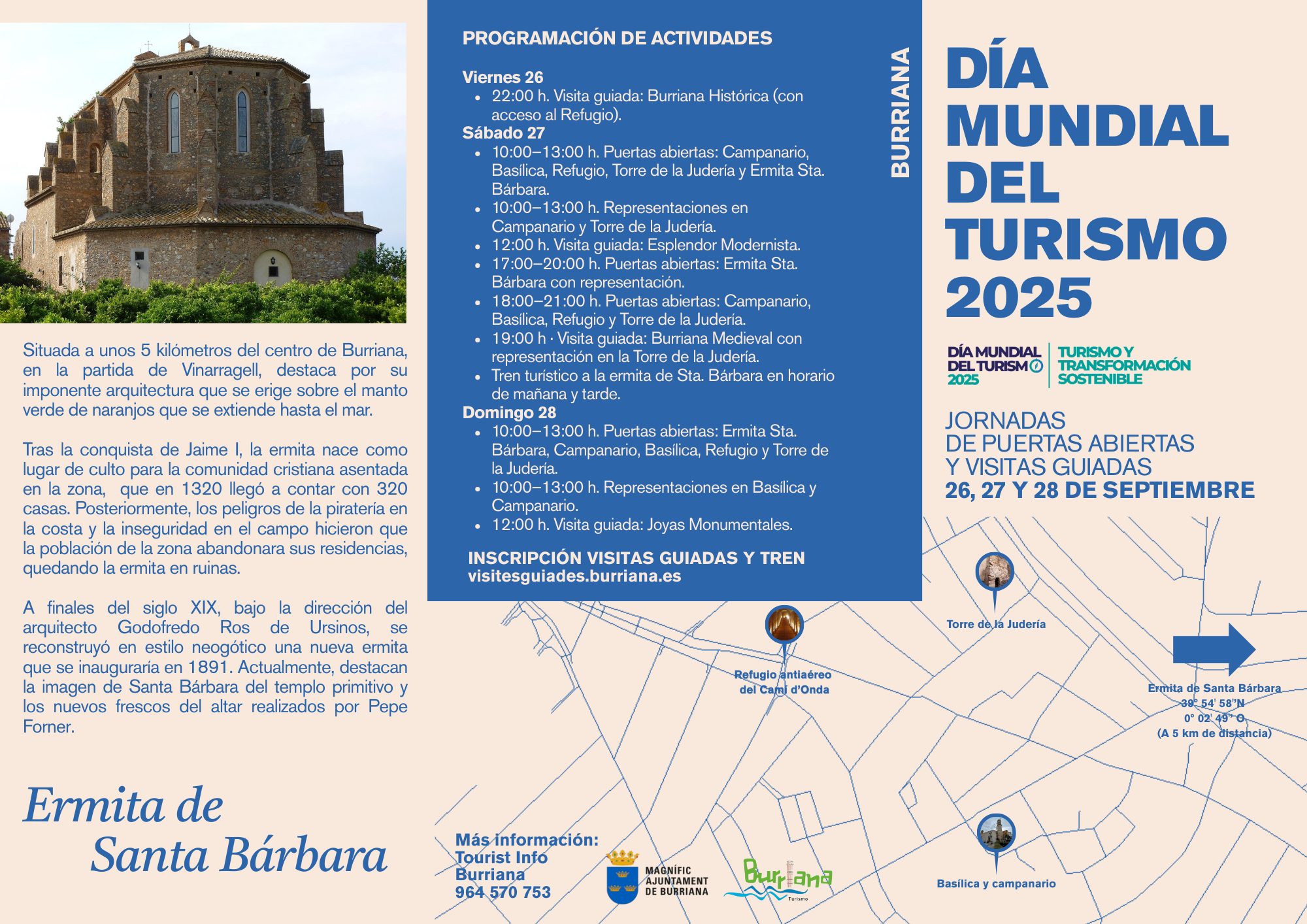 Como novedad este año, los asistentes podrán desplazarse hasta la Ermita de Santa Bárbara en un tren turístico gratuito, facilitando el acceso a este emblemático enclave. Entre las actividades más destacadas se incluyen las rutas temáticas «Burriana Histórica», «Esplendor Modernista» (con degustación), «Burriana Medieval» y «Joyas Monumentales» además de animaciones culturales en distintos puntos del centro histórico.