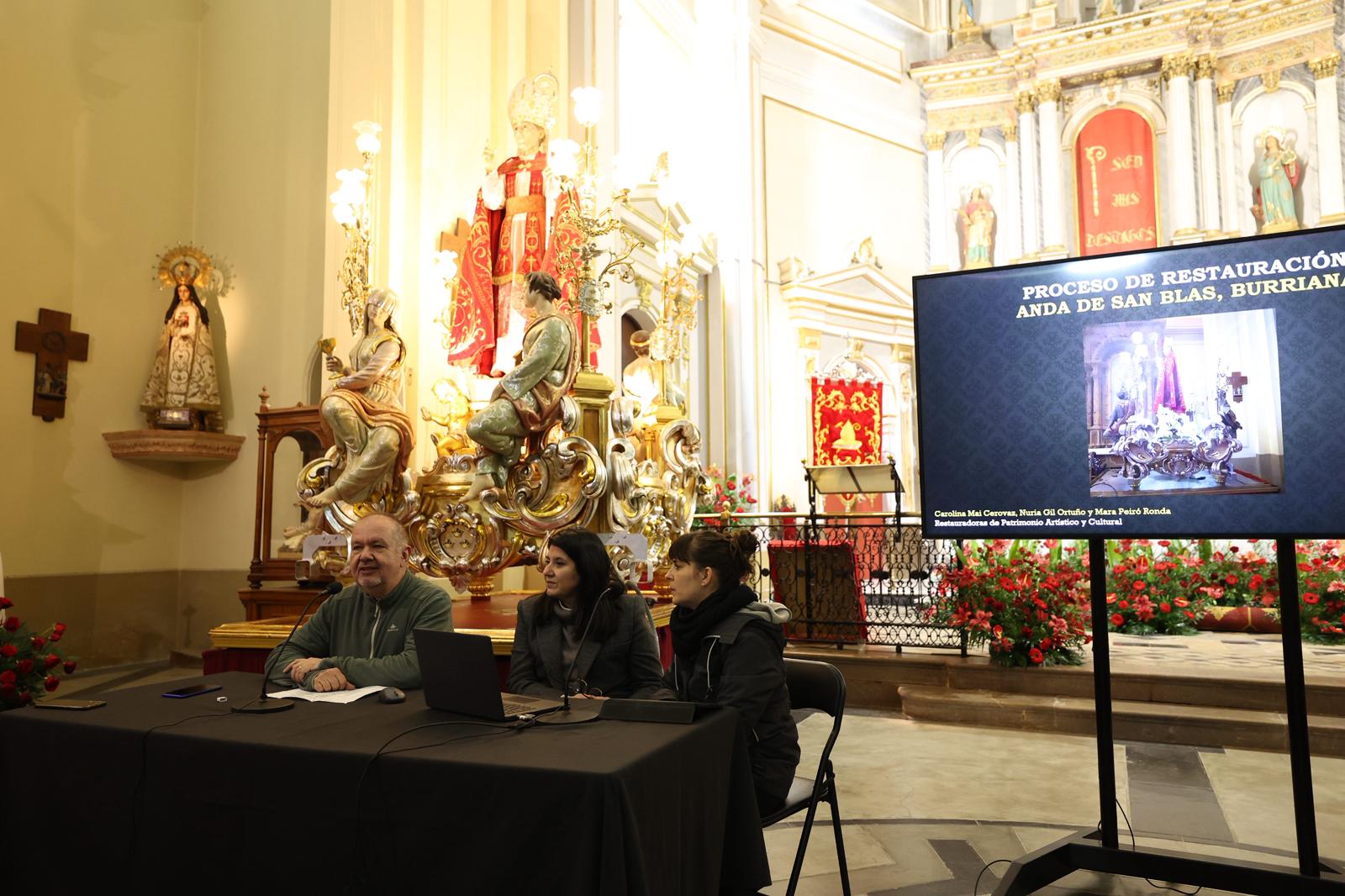 A partir de las 19:00 horas, el foco de las jornadas se ha trasladado a la Iglesia de Sant Blai, donde ha tenido lugar un ciclo de conferencias técnicas. La primera ponencia, titulada “La restauración de la peana de Sant Blai”, ha corrido a cargo de las expertas Nuria Gil Ortuño, Carolina Mai Cerovaz y Mara Peiró Ronda, quienes han detallado a la perfección el proceso de intervención y recuperación de este elemento de alto valor simbólico para la ciudadanía.