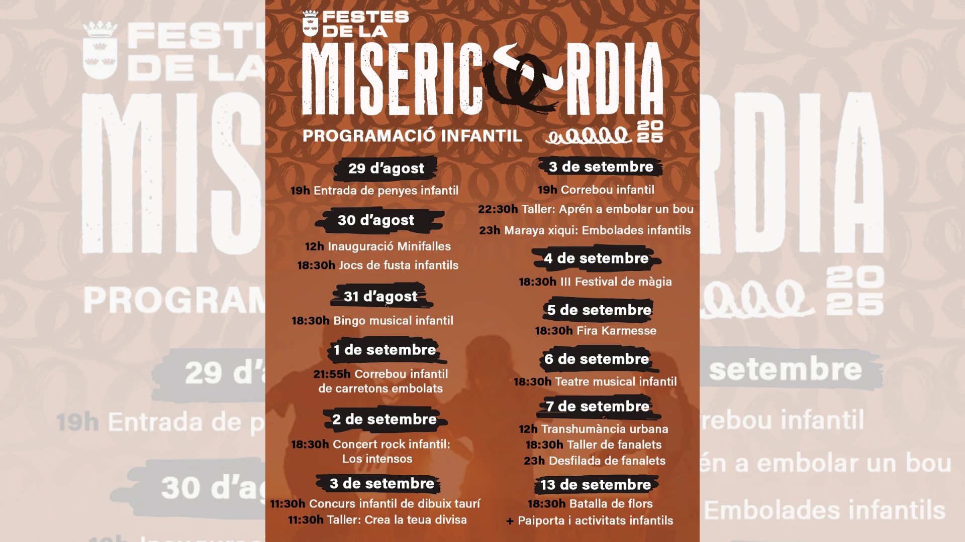 El dimarts 2 de setembre, la música serà la protagonista amb el concert de rock infantil “Los Intensos”, una actuació que promet fer vibrar al públic infantil amb cançons divertides i plenes de ritme. El dimecres 3, a les 11.30 h, se celebrarà el concurs infantil de dibuix taurí i el taller creatiu “Crea la teua divisa”, organitzats per la Federació Taurina. Eixa mateixa vesprada, a les 19.00 h, tornarà el correbous infantil. A la nit, a partir de les 22.30 h, es realitzarà un taller didàctic per aprendre a embolar un bou, seguit a les 23.00 h de les embolades infantils Maraya Xiqui.