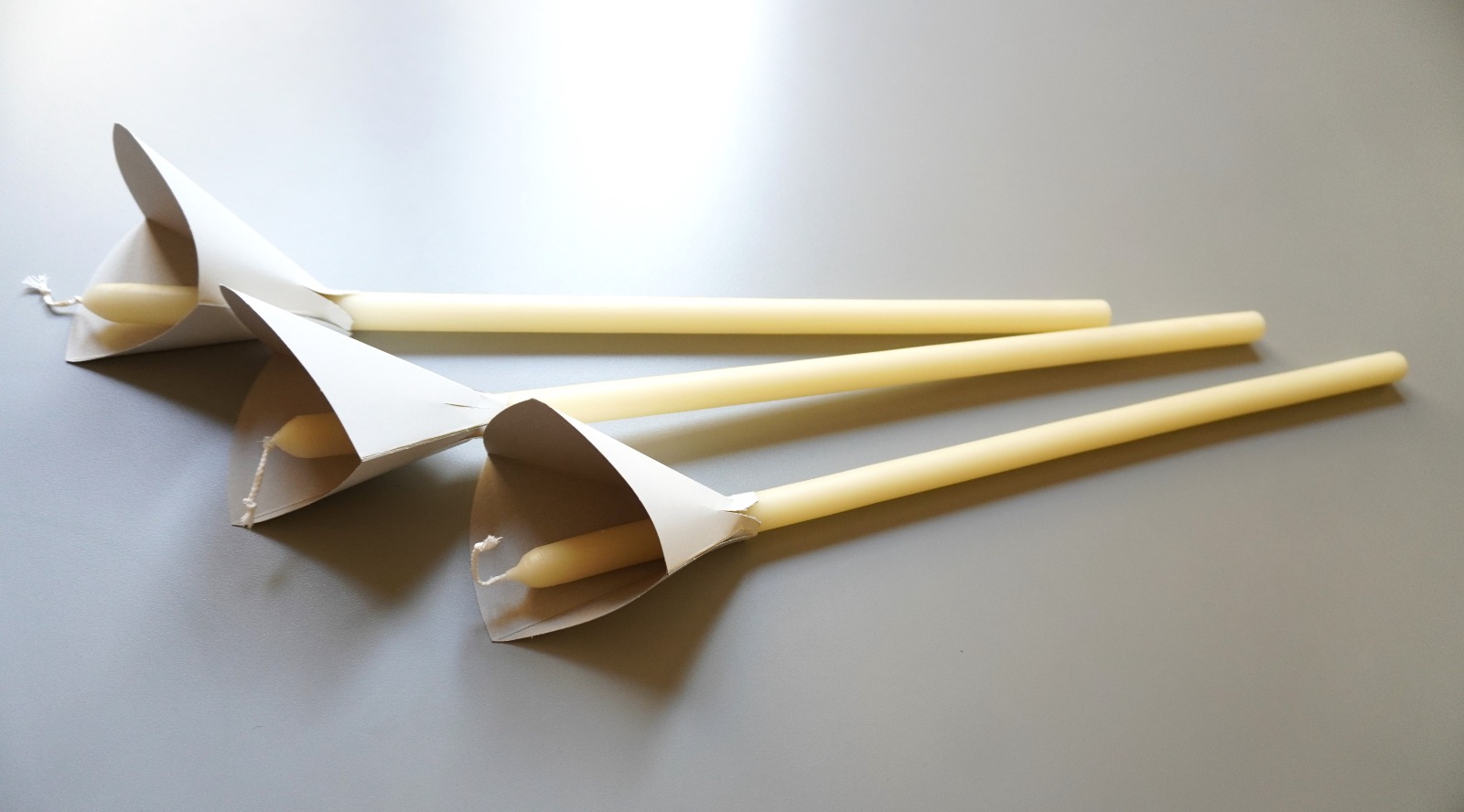 Durante el viernes, 2 de febrero, y el sábado, 3 de febrero, se realizará respectivamente el traslado de la imagen de Sant Blai desde la ermita hasta la Basílica del Salvador y la procesión al patrón. Durante los actos litúrgicos se repartirán estas capuchas de cartón, que llevarán el escudo de la ciudad serigrafiado, no solo con el objetivo de mantener las calles limpias recogiendo y almacenando la cera durante las procesiones, sino también para proteger la llama del viento, permitiendo que las velas permanezcan encendidas mientras transcurra el trayecto, además de evitar que la cera manche el cirio.