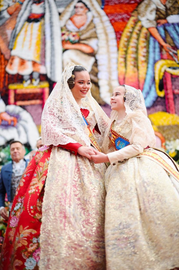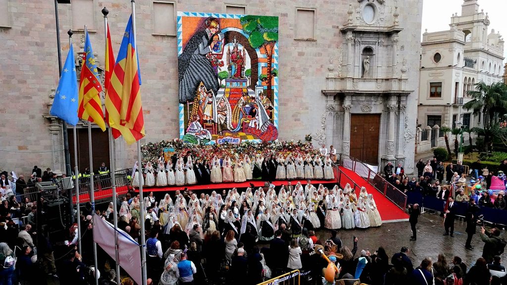 Ante el tapiz fallero confeccionado artesanalmente mediante la técnica del «paperet», de nuevo obra del artista local Juan Dualde junto a la colaboración de la Federació de Falles de Burriana, los falleros y falleras de todas las edades han depositado sus ramos en honor a la patrona de la ciudad.