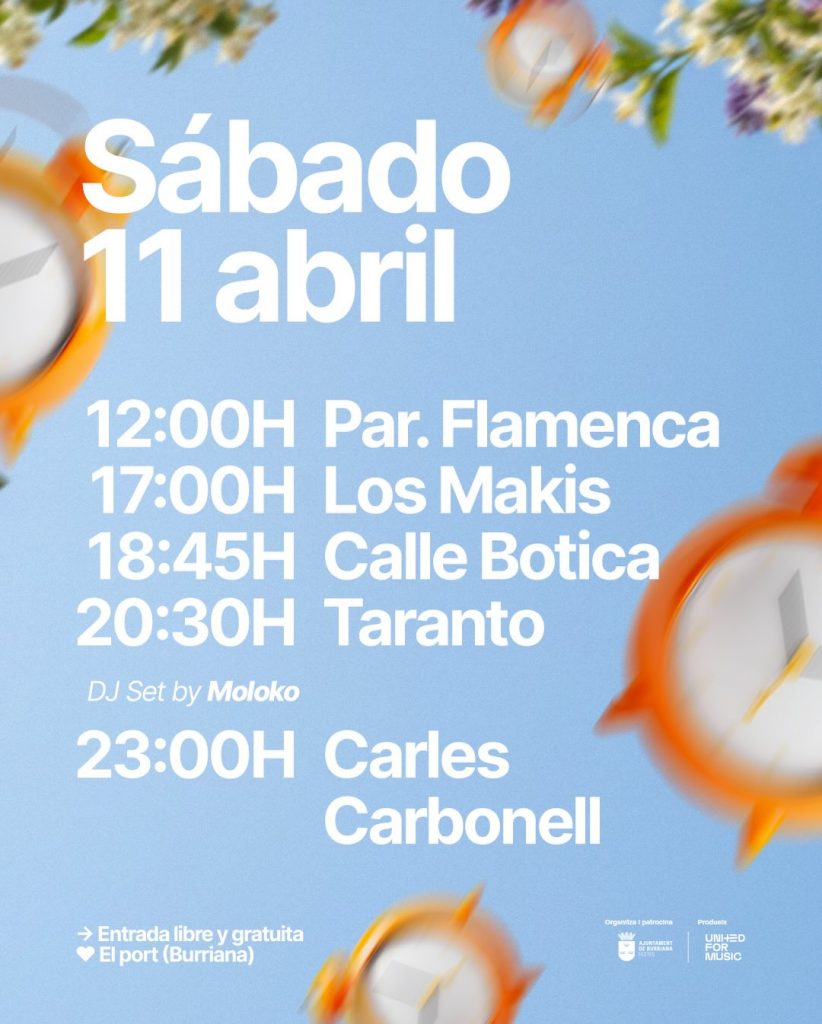 El sábado 11 de abril, la música no dará tregua y comenzará desde el mediodía. A las 12:00h, Paradita Flamenca será la encargada de amenizar las primeras horas del día en el Puerto. Tras un breve descanso, la tarde del sábado se convertirá en un auténtico despliegue de talento con las actuaciones sucesivas de Los Makis (17:00h), Calle Botica (18:45h) y Taranto (20:30h). Como broche final a esta tercera edición, tras una nueva intervención de DJ Moloko, Carles Carbonell subirá al escenario a las 23:00h para cerrar el festival por todo lo alto.