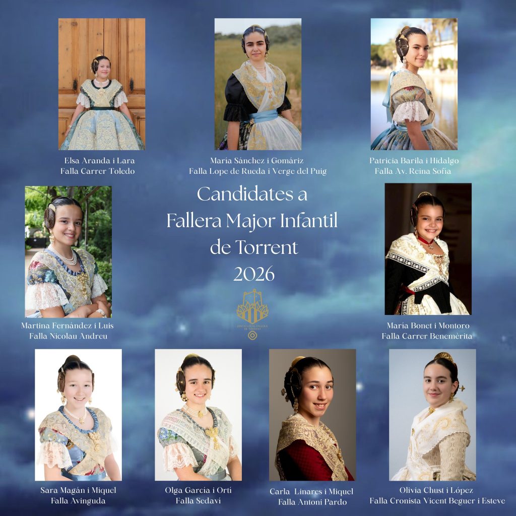 La Junta Local Fallera de Torrent ha dado a conocer esta tarde los nombres de las elegidas por el jurado para ser las cortes de honor y falleras mayores de Torrent de 2026. Dicho jurado ha estado formado por: Lola Flor, Maria Donderis, Elena Martinez, Josep Vicent Zaragoza y Blanca Gemma Gamborino. Así pues, las elegidas como Corte de Honor Infantil, dentro de las cuales está la próxima fallera mayor infantil de la ciudad son: