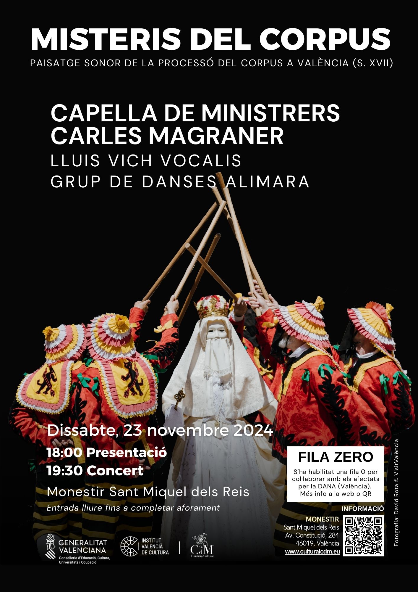 Capella de Ministrers ofrecerá el programa Misteris del Corpus en el Monasterio San Miguel de los Reyes de Valencia que acogerá una presentación, Teatralitat i música en el Corpus valencià, a cargo de Francesc Villanueva, el sábado 23 a las 18h, y la actuación a las 19:30h. La formación, dirigida por Carles Magraner, junto con Lluis Vich Vocalis y el Grup de Danses Alimara, bajo la dirección de Ximo Martí y Salvador Mercado, abordará con 40 músicos, cantantes y bailarines, obras vinculadas con la procesión del Corpus Christi en un viaje musical a la Valencia del siglo XVII. Para este concierto la Fundación Cultural CdM ha abierto una línea de donaciones y ha habilitado una fila cero destinada a ayudar a los afectados por la catástrofe de la DANA; la entrada es libre y gratuita hasta completar el aforo.