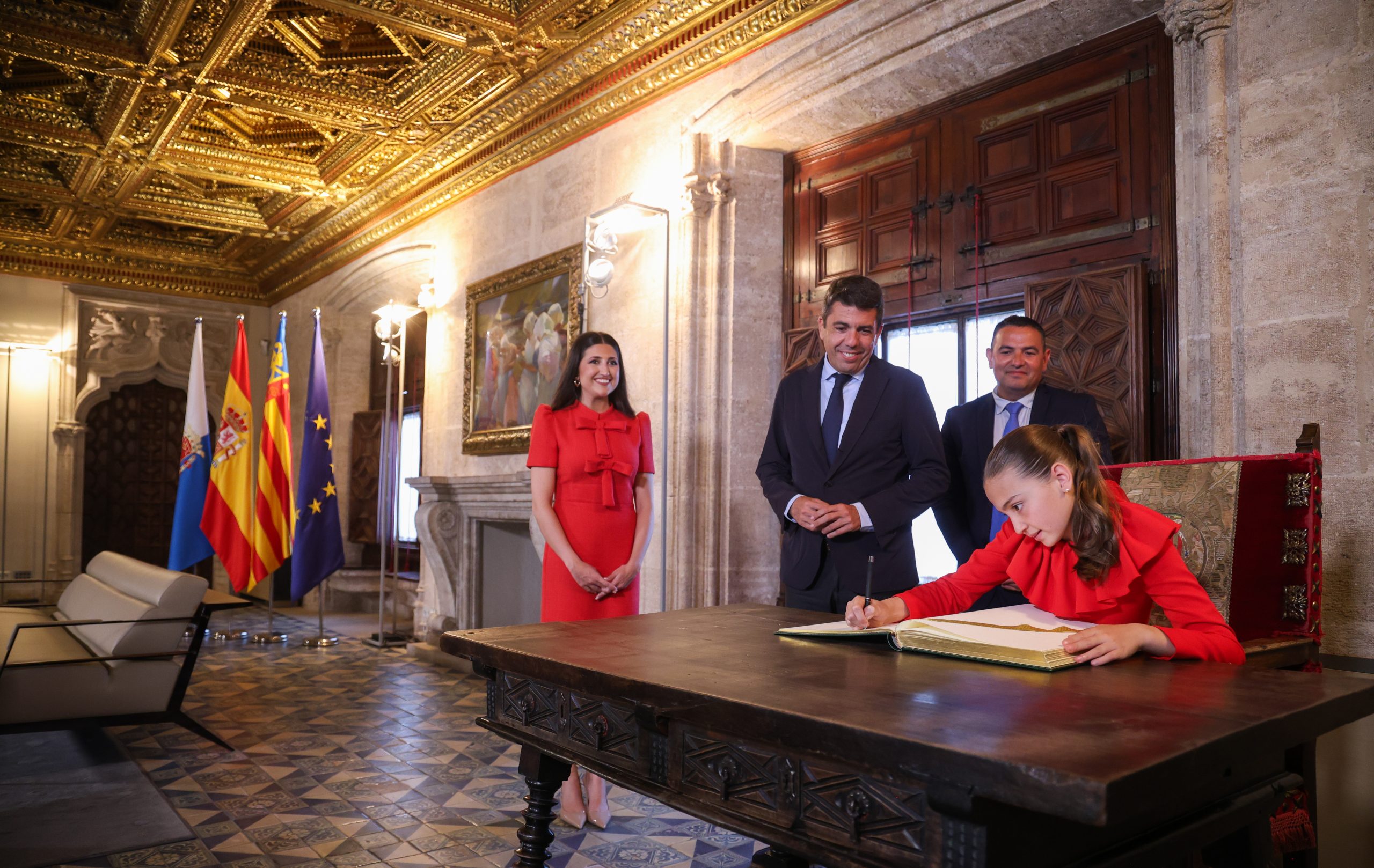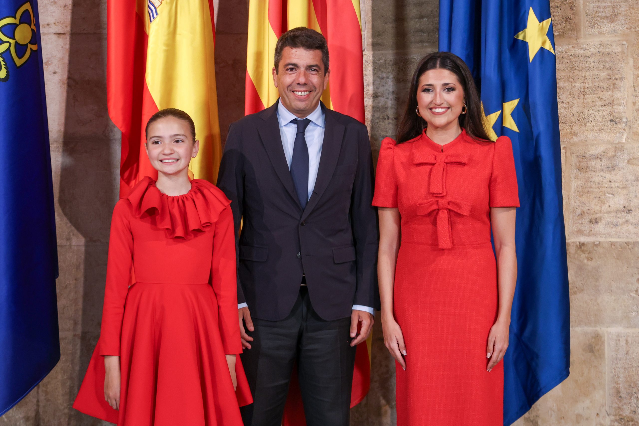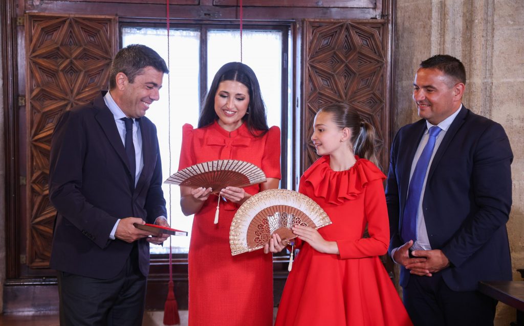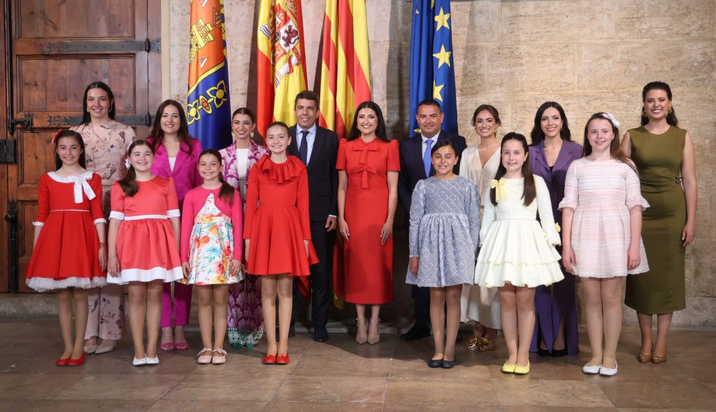 El president de la Generalitat, Carlos Mazón, ha recibido a las Belleses del Foc 2025 de Alicante, Adriana Vico y Valentina Tárraga, y a sus damas de honor, que han estado acompañadas por David Olivares, presidente de la Federació de les Fogueres de Sant Joan.