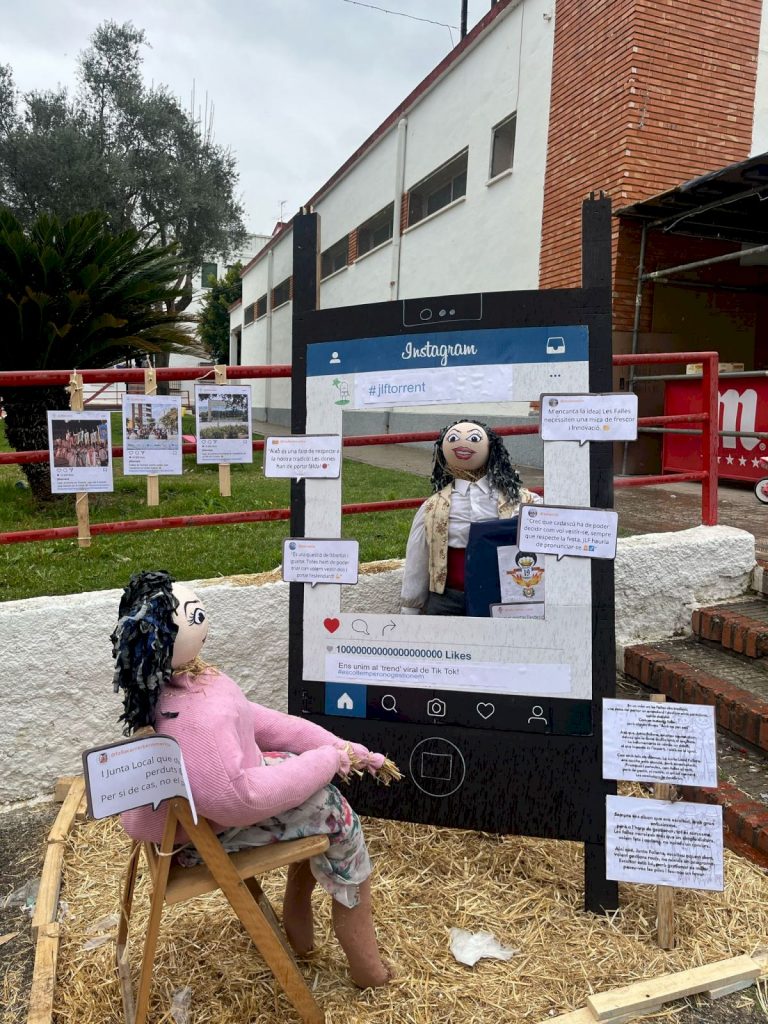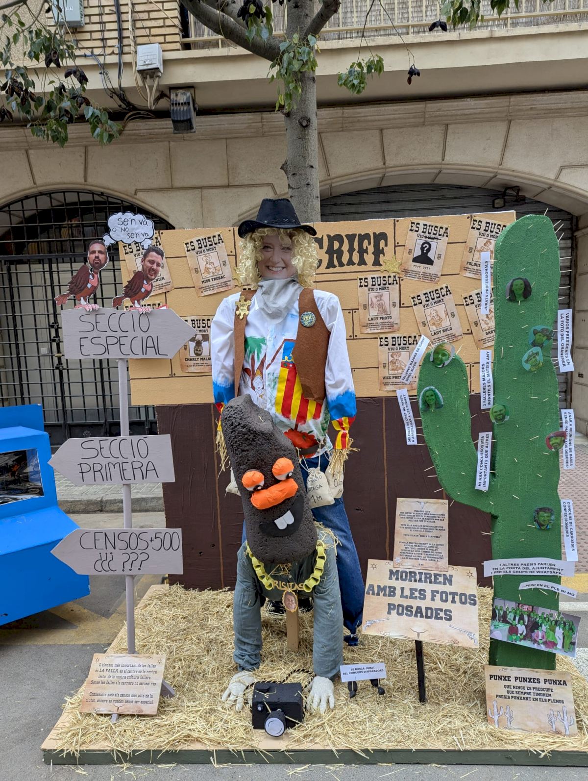 «Moriren amb les fotos posades» es el título del «pallasso» ganador del primer premio, de la Falla Carrer Benemérita, y que recoge en un tablón de Sheriff del lejano oeste la actualidad fallera y política de la ciudad, desde el exceso de fotos y bulos en las publicaciones, a la ausencia del vicepresidente 1 de Junta Local Fallera o los «trucos» en los censos de las comisiones torrentinas para caer en una sección más cómoda, entre otros temas.