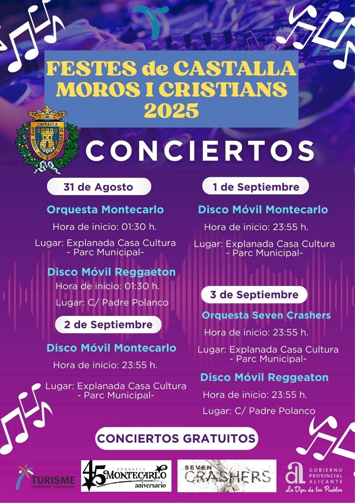 El Ayuntamiento de Castalla ha presentado la programación de las Fiestas Mayores de Moros y Cristianos 2025. Las celebraciones populares en honor a la Patrona, la Virgen de la Soledad, tendrán lugar del 31 de agosto al 4 de septiembre. El consistorio organiza estas tradicionales fiestas en colaboración con la Agrupació de Comparses de Moros i Cristians de Castalla.