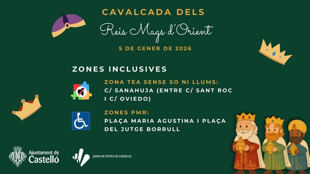 La zona inclusiva se ubicará al inicio de la Cabalgata, en la esquina de la calle Oviedo con la calle San Roque, y estará debidamente señalizada mediante dos banderolas identificativas. Asimismo, se habilitarán dos espacios reservados para personas con movilidad reducida (PMR), con el objetivo de garantizar una experiencia cómoda y accesible. Estos puntos estarán situados en la plaza María Agustina y en la plaza Juez Borrull.