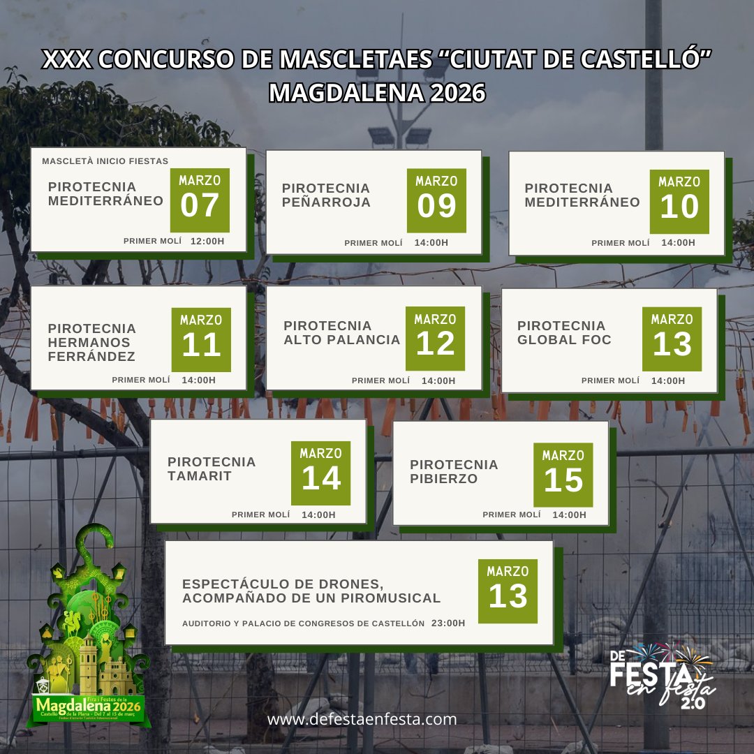 En cuanto al XXX Concurso de Mascletàs “Ciutat de Castelló”, el orden de participación será el establecido tras el correspondiente sorteo. El lunes arrancará la competición con Pirotecnia Peñarroja, el martes tomará el relevo Pirotecnia Mediterráneo, el miércoles será el turno de Pirotecnia Hermanos Ferrández, el jueves disparará Pirotecnia Alto Palancia, el viernes llegará el espectáculo de Pirotecnia Global Foc, el sábado será el turno de Pirotecnia Tamarit, y el broche final del concurso lo pondrá Pirotecnia Pibierzo, que será la encargada de lanzar la última mascletà del concurso.