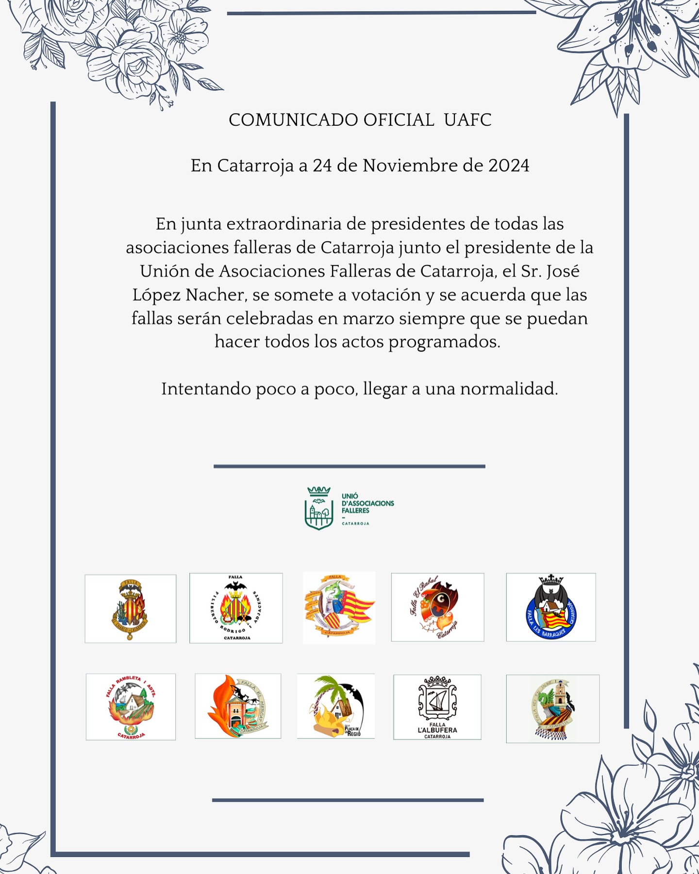En el comunicado emitido a través de las redes sociales, la UAFC da su apoyo y ánimo a la corte de honor, al presidente infantil de Catarroja, Ximo Núñez y a las falleras mayores de la ciudad, Carla Chardí y Cel Rodrigo, a quienes les ha tocado ostentar los cargos en una época que por circunstancias meteorológicas es dura.