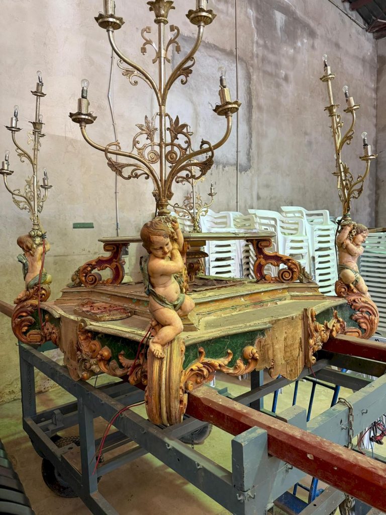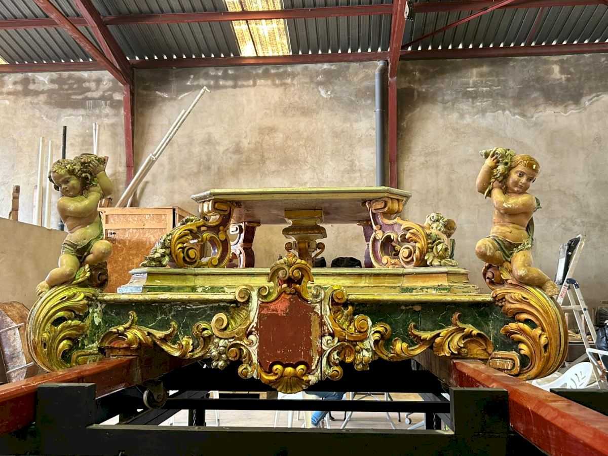 A més, s’ha actuat sobre elements que havien perdut la seua lectura iconogràfica: “els escuts i alguns volums de les ales dels querubins havien perdut els seus atributs a causa dels repintats anteriors. Dos dels escuts estan en procés de restauració i un, probablement perdut durant la DANA, es reproduirà a partir dels motlles dels conservats per tal que el conjunt recupere completament el seu sentit i esplendor original”.